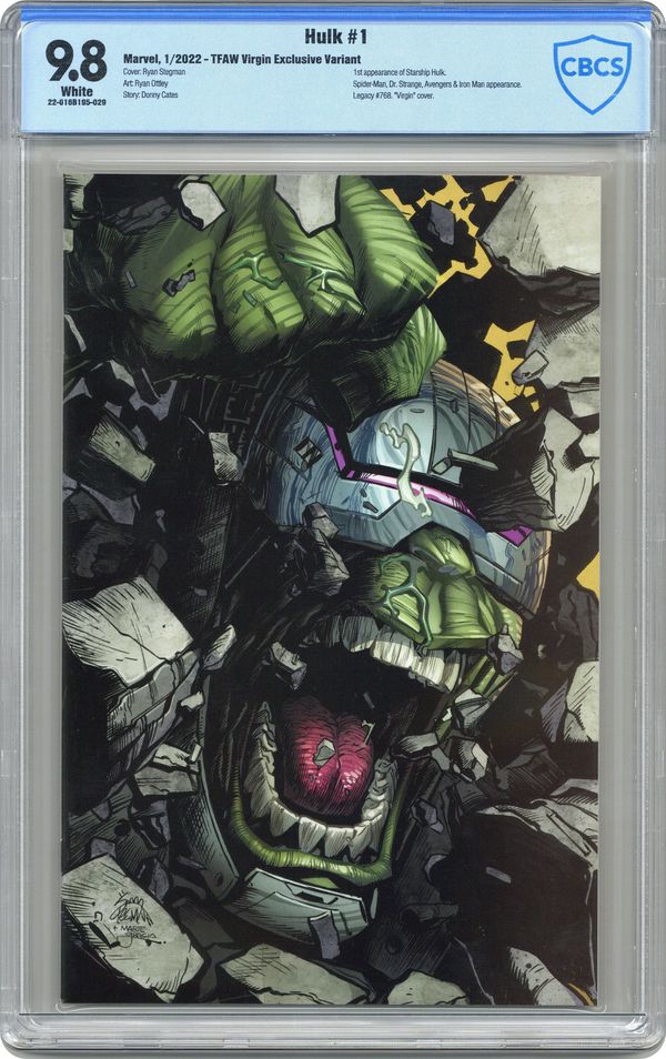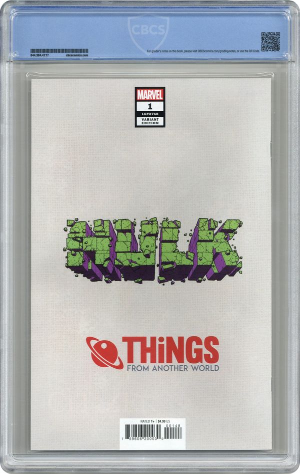 Things from Another World Exclusive Virgin Cover by Ryan Stegman. Written by Donny Cates. Art by Ryan Ottley. IMMORTAL NO LONGER! CATES & OTTLEY DELIVER A NEW, COLOSSAL-SIZED ERA! MAD SCIENTIST Part 1 of 6 The uncontrollable rage of the Hulk has reached an all-new level, and nobody – including the Avengers – is prepared to handle it. But is it really the Hulk that people should be afraid of, or is there something missing to this puzzle? Join the superstar creative team of Donny Cates and Ryan Ottley as they look to the stars for the next era of HULK! 36 pages, full color. Rated T+ Grade: CBCS 9.8 explanation of grade Condition: Used (collectible)