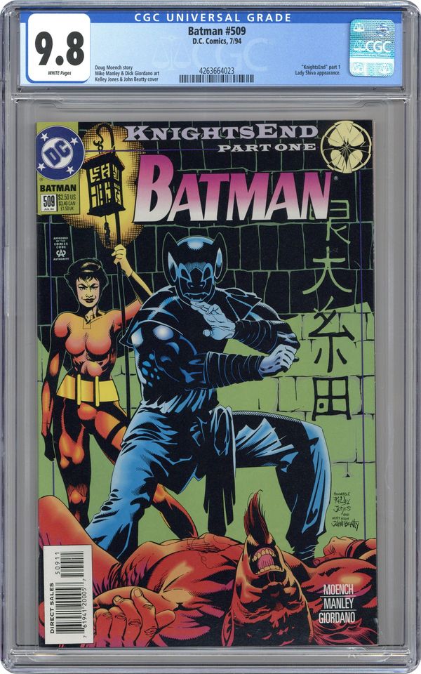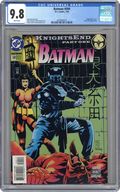 This extra-sized issue begins 'KnightsEnd,' a new multi-part story arc in the saga of the Dark Knight. With the failure of Bruce Wayne's encounter with Batman in Robin (1993-2009) #7 weighing on him, Wayne turns to his old foe, Lady Shiva, for help in retraining. Meanwhile, moving in on an arms dealer, Batman discovers that the perpetrator might actually be an old and deadly enemy of the Order of St. Dumas. Continued in Batman Shadow of the Bat (1992) #29. Written by Doug Moench, with art by Mike Manley and Dick Giordano. Cover by Kelley Jones and John Beatty. 52 Pages, Full Color. Cover price $2.50. Grade: CGC 9.8 explanation of grade Condition: Used (collectible)