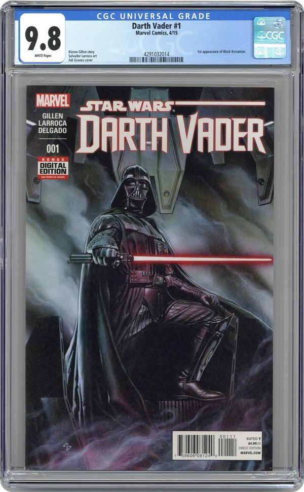 Ended Oct 20 2023 Winning Bid $80 Written by Kieron Gillen. Art by Salvador Larroca. Cover by Adi Granov. The original Dark Lord of the Sith stars in his first ongoing series! Ever since Darth Vader made his first on-screen appearance, he became the one of the most popular villains to ever haunt an audience's dreams! Now, follow Vader straight from the ending of A NEW HOPE (and the pages of the new STAR WARS comic book) into his own series, showing the Empire's war with the Rebel Alliance from the other side! 44 pages, full color. Rated T Cover price $4.99. Grade: CGC 9.8 explanation of grade Condition: Used (collectible)