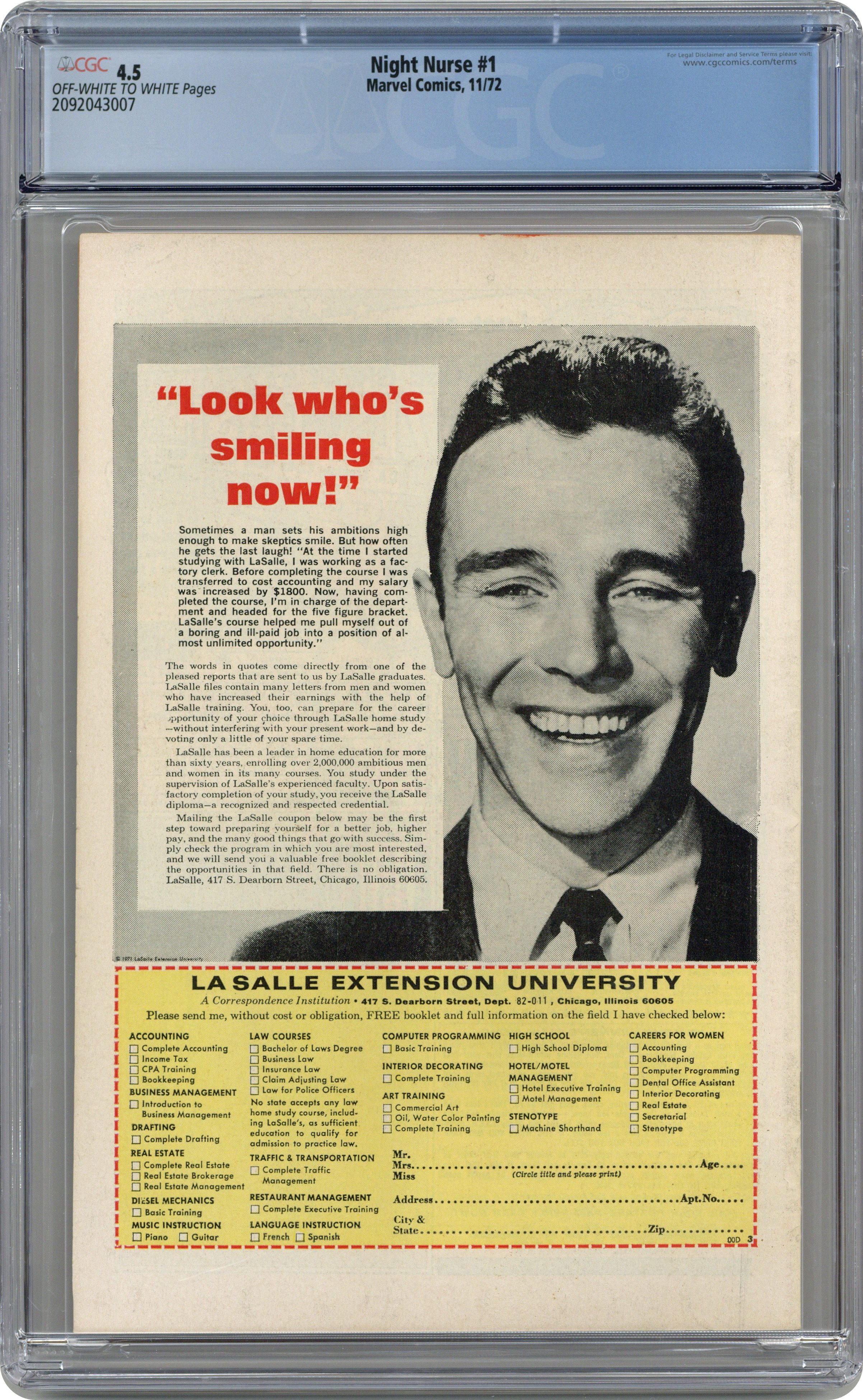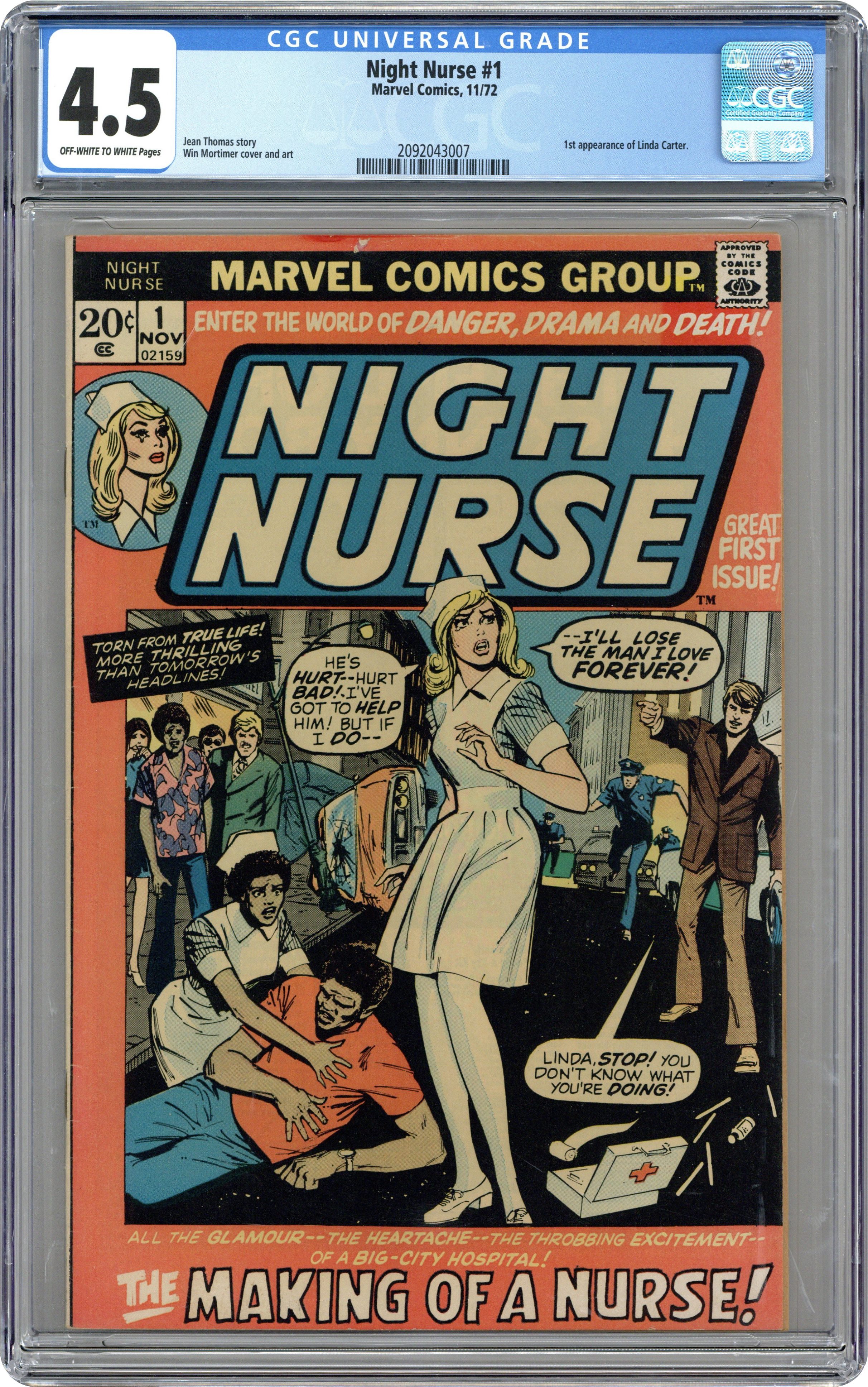 Cover art by Win Mortimer. "The Making of a Nurse!", script by Jean Thomas, art by Win Mortimer; Linda Carter, Georgia Jenkins, and Christine Palmer all study to be nurses; Marshall Michaels asks Linda Carter to marry him but insists that she give up on being a nurse; When all of the city's power goes out Ben Jenkins (Georgia's brother) and Rocky try to hold the hospital's generator hostage; When Ben listens to his sister and tries to stop Rocky he is shot; Linda turns down Marshall's marriage proposal to become a nurse. Ad for The Cat comic book series. 36 pgs., full color. Cover price $0.20. Grade: CGC 4.5 explanation of grade Condition: Used (collectible)