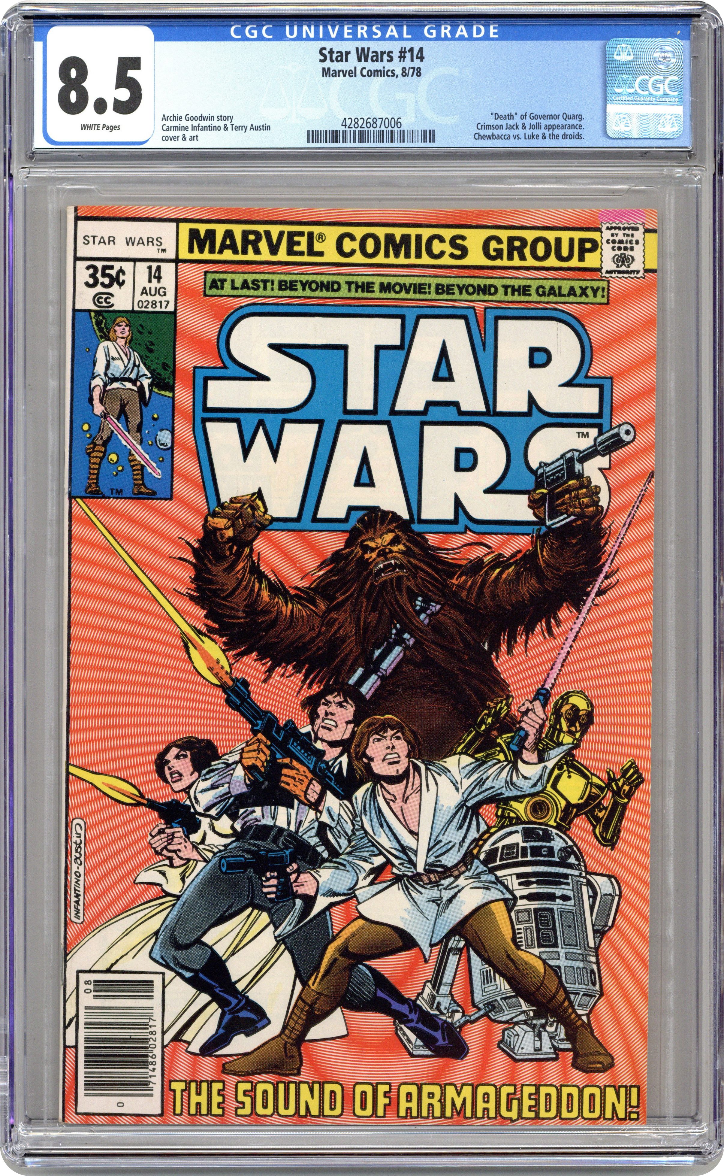 Ended Oct 7 2023 Winning Bid $15 "The Sound of Armageddon!" Written by Archie Goodwin. Art by Carmine Infantino and Terry Austin. Luke, Leia, Han, and the rest battle pirates, sea monsters and each other on a dangerous and desolate waterworld. Cover price $0.35. Grade: CGC 8.5 explanation of grade Condition: Used (collectible)