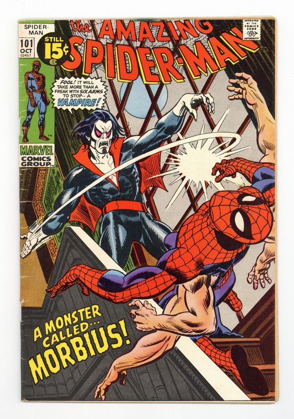 Ended Oct 19 2023 Winning Bid $206 First appearance of Morbius the Living Vampire in "A Monster Called Morbius!" Script by Roy Thomas. Pencils by Gil Kane. Inks by Frank Giacoia. Cover by Gil Kane and John Romita. The first 100 issues of the Amazing Spider-Man title are in the books! And the next chapter in the web-slinger's anthology kicks off with the debut of Marvel's first bronze age vampire: Morbius! However, at the moment Peter Parker has a much bigger problem on his (six) hands. After drinking the special potion he developed, Aunt May's nephew grew four additional arms! Oh, my goodness! Peter is desperate to find a way to remove the arms, so he calls Dr. Curt Connors for help. Dr. Connors has a summer house and laboratory in Southampton on Long Island...and he gives Spider-Man permission to stay there and work on a cure. Meanwhile, a strange, pale, and bloodthirsty man is the sole survivor of a shipwreck near Southampton. And he's looking for a quiet place to rest. Oh no. Is the six-armed Spider-Man on a collision course with a living vampire? Oh yes! Cameo appearances by Gwen Stacy, J. Jonah Jameson, Joe Robertson, and the Lizard. Last 15ยข cover price. (Notes: This is the first issue of the Amazing Spider-Man series not written by Stan Lee. There exists a second printing of this issue published in 1992 with a silver background cover. Marvel also published a facsimile edition of Amazing Spider-Man 101 in 2021.) 36 pages. Cover price $0.15. Grade: VG+ 4.5 explanation of grade Condition: Used (collectible)