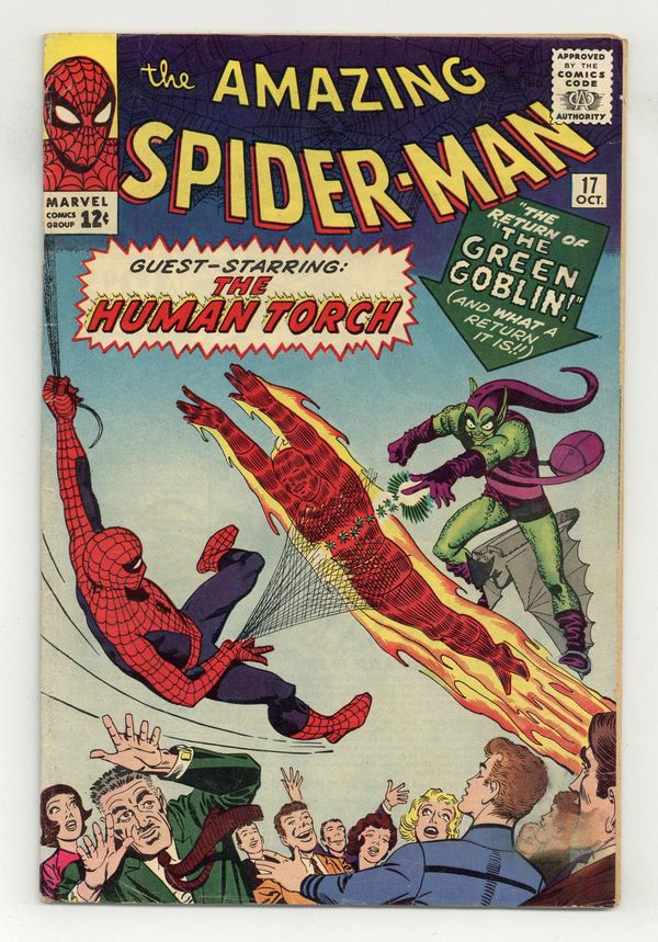 Cover art by Steve Ditko. Second appearance of the Green Goblin in The Return of the Green Goblin!, script by Stan Lee, art by Steve Ditko; Spider-Man attends a fan club meeting organized by Flash Thompson, but the Green Goblin crashes the meeting; Fortunately the Human Torch is in attendance to help Spider-Man; During the battle Spider-Man finds out that Aunt May is in the hospital and he leaves, causing everyone to believe that he is a coward. Reprinted in Marvel Tales # 12 and 155. Letter to the editor by comics writer Doug Moench. 36 pgs. $0.12. Cover price $0.12. Grade: VG 4.0 explanation of grade Condition: Used (collectible)