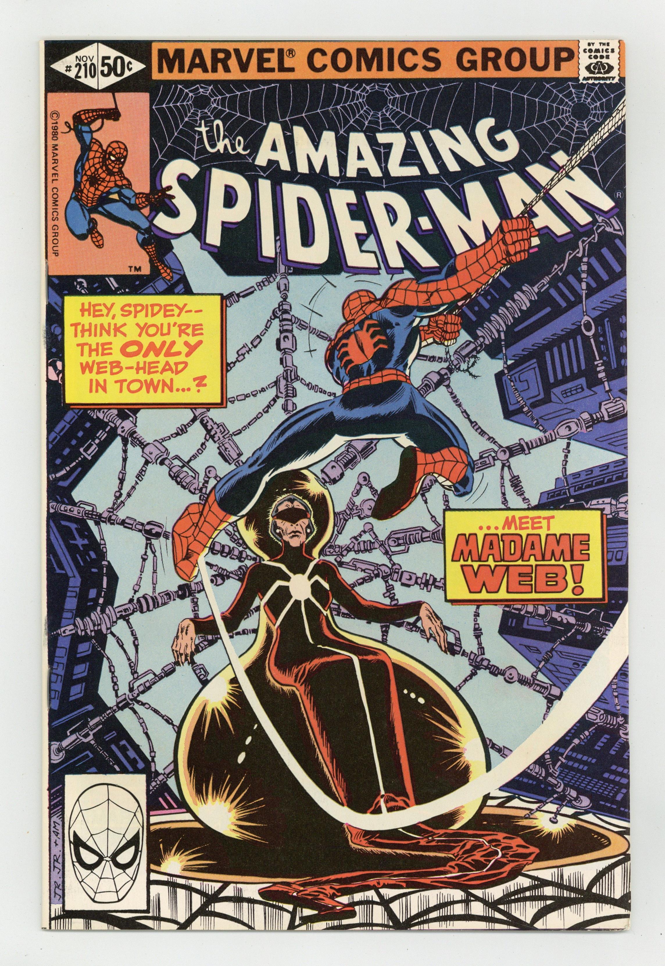 Direct Edition. "The Prophecy of Madame Web!" First appearance of Madame Web. Script by Denny O'Neil. Art by John Romita Jr. (breakdowns) and Joe Sinnott (finishes). Cover by John Romita Jr. and Al Milgrom. Masked gunmen barge into the board room of the Daily Globe and kidnap its publisher K.J. Clayton! Fortunately though, the web-slinger is nearby and gives chase! The wall-crawler doesn't catch the criminals, but he does catch a clue! A mysterious clairvoyant called Madame Web is somehow connected to the victim! After befriending the aging soothsayer and heeding her advice, Spider-Man rushes off to the rescue! Can the web-slinger find the missing publisher and get the Daily Globe back in circulation? Cameo appearance by J. Jonah Jameson. (Notes: Peter Parker ends his employment with the Daily Globe. Madame Web appears next in Amazing Spider-Man 216. John Romita Jr. begins his three-and-a-half year run as the penciler of the Amazing Spider-Man title.) 36 pages, full color. Cover price $0.50. Grade: VF 8.0 explanation of grade Condition: Used (collectible)