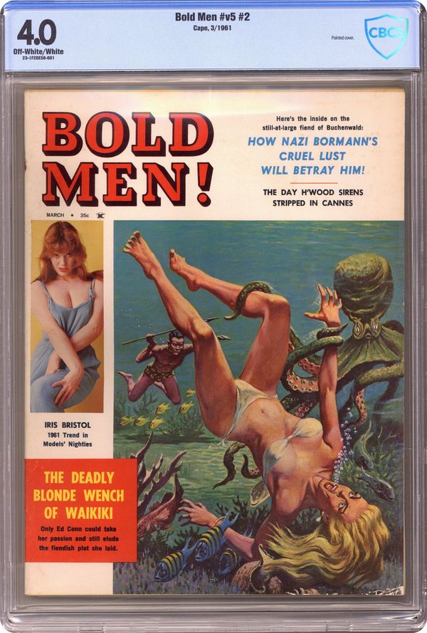 Volume 1, Issue 2 - March 1961. Vintage Men's interest magazine focusing on pictorials, and adventure stories. This issue features "How Nazi Bormann's Cruel Lust will Betray Him!" "The Day Hollywood Sirens Stripped in Cannes!" and "The Deadly Blonde Witch of Waikiki!" 8 1/2-in. x 11-in., 68 pages, B&W. MATURE READERS Cover price $0.35. Grade: CBCS 4.0 explanation of grade Condition: Used (collectible)