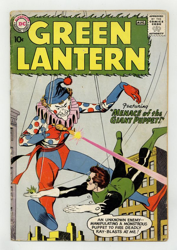 Ended Oct 28 2023 Winning Bid $380 Cover pencils by Gil Kane, inks by Joe Giella. Buzzy Says: Free Speech -- Free For All! public service announcement, script by Jack Schiff, art by Win Mortimer. The Planet of Doomed Men, script by John Broome, pencils by Gil Kane, inks by Murphy Anderson; Hal Jordan's energy-duplicate is summoned by the Guardians for the first time. After he is returned to Earth the Guardians send him to Calor, a nearby planet, to save the Calorians from the ape-monster Dryg. Many Loves of Dobie Gillis ad, art by Bob Oksner. Menace of the Giant Puppet!, script by John Broome, pencils by Gil Kane, inks by Joe Giella; The Puppet-Master invents a Hypno-Ray and commits crimes using others as puppets, until he attempts to capture Green Lantern, who instead captures him. Meanwhile, Carol Ferris daydreams of marrying Green Lantern. Letter to the editor from comic writer Roy Thomas. 36 pages, full color. Cover price $0.10. Grade: GD+ 2.5 explanation of grade Condition: Used (collectible)