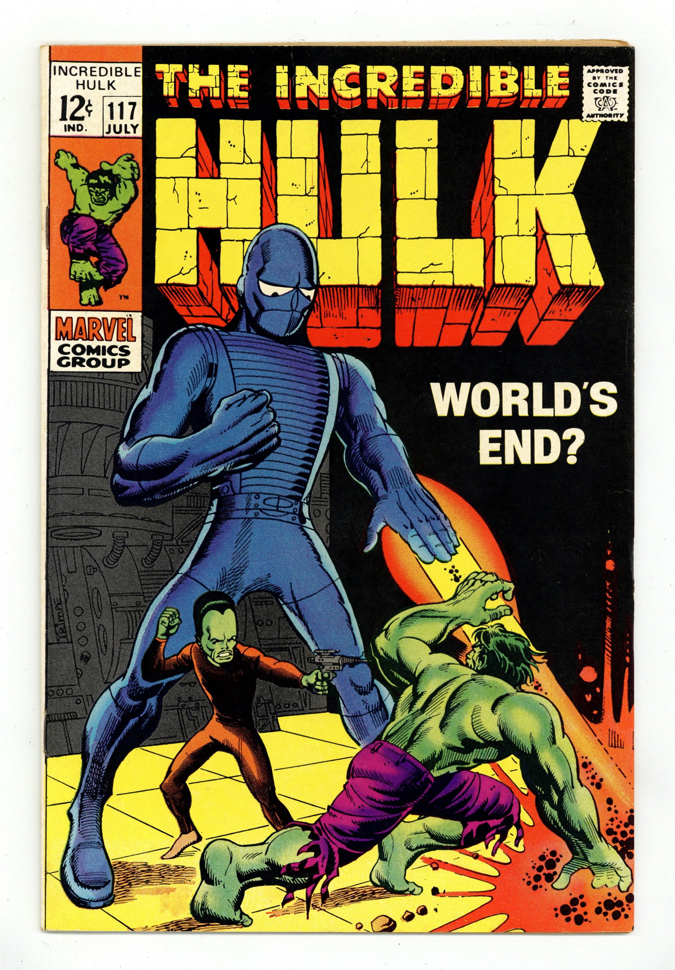 Last 12-cent cover price issue. Cover art by Herb Trimpe. World's End?, script by Stan Lee, art by Herb Trimpe; The Leader pushes the button, firing a missile at Russia as he tries to touch off World War III; The Hulk has to battle the Super Humanoid in time to get back and stop the missile from striking its target but he takes too long beating the indestructible plastic monster; Willing himself to turn back into Banner, the brilliant scientist uses an experimental hunter missile to knock down the first one; So the Leader pushes the button again and this time it is the Hulk who comes to the rescue. 36 pgs. $0.12. Cover price $0.12. Grade: VG/FN 5.0 explanation of grade Condition: Used (collectible)