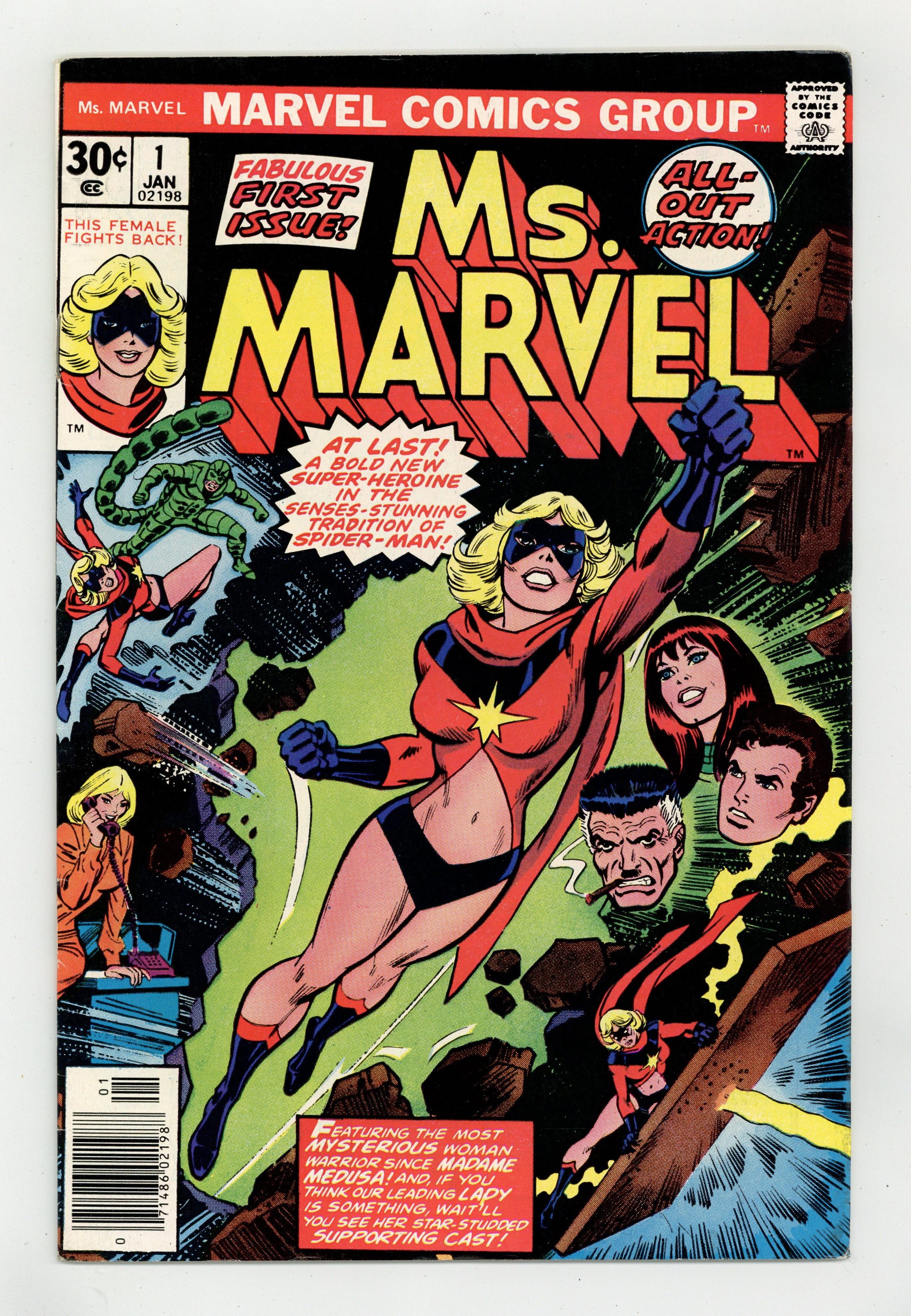 John Romita/Dick Giordano cover. John Buscema art. Gerry Conway script. Joe Sinnott/David Hunt inks. Marie Severin colors. "This Woman, This Warrior" Carol Danvers meets Peter Parker, J. Jonah Jameson, Mary Jane Watson, and battles the Scorpion when she gets a job at the Daily Bugle as a fashion editor. Intro Ms. Marvel, Carol Danvers, who last appeared in Captain Marvel # 40. 1st appearance of Ms Marvel. 36 pages, full color. Cover price $0.30. Grade: FN/VF 7.0 explanation of grade Condition: Used (collectible)