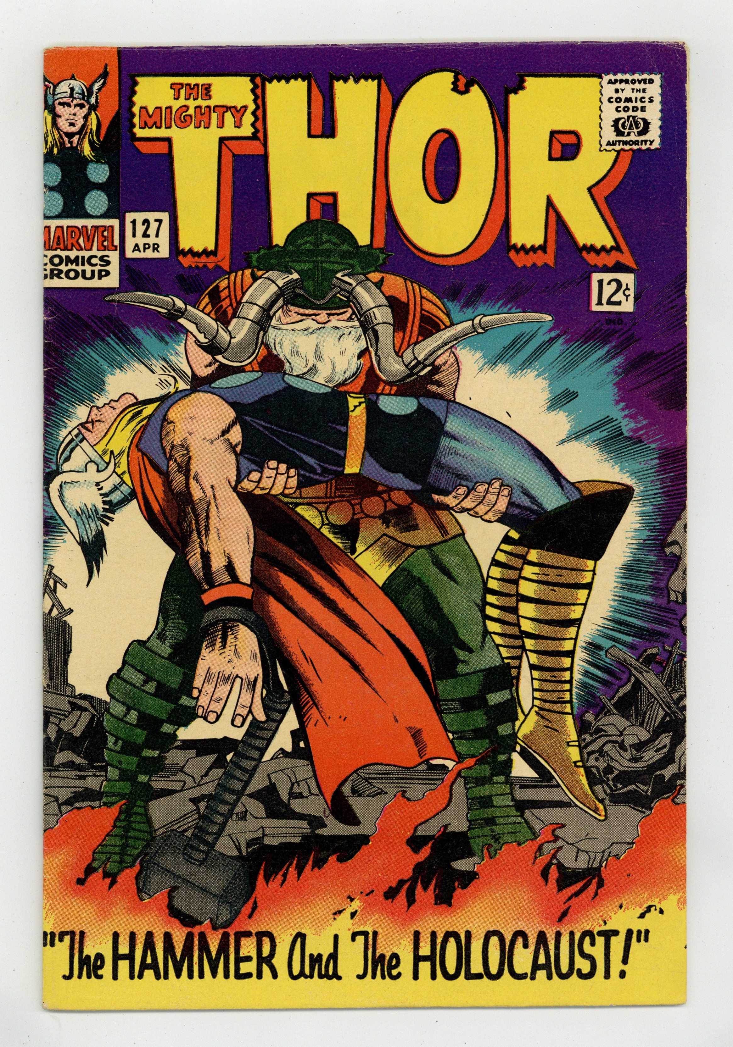 Cover pencils by Jack Kirby, inks by Vince Colletta. Pluto (from Red Raven Comics #1, August 1940) is reintroduced in "The Hammer and the Holocaust!", script by Stan Lee, pencils by Jack Kirby, inks by Vince Colletta; The weakened and defeated Thor returns to Asgard where he finds Seidring has taken over; He battles the 'odin power' and defeats Seidring only to collapse himself. Appearances by Odin, Hercules, Jane Foster, Balder, and Heimdall. Marvel Bullpen Bulletins. Tale of Asgard: "The Meaning of... Ragnarok", script by Stan Lee, pencils by Jack Kirby, inks by Vince Colletta; The Asgardian gods have returned to Asgard where the prophetess Vollo relates the coming of Ragnarok! Odin and Balder appearances; Heimdall and Fandral cameos. 36 pgs., full color. $0.12. Cover price $0.12. Grade: VG/FN 5.0 explanation of grade Condition: Used (collectible)