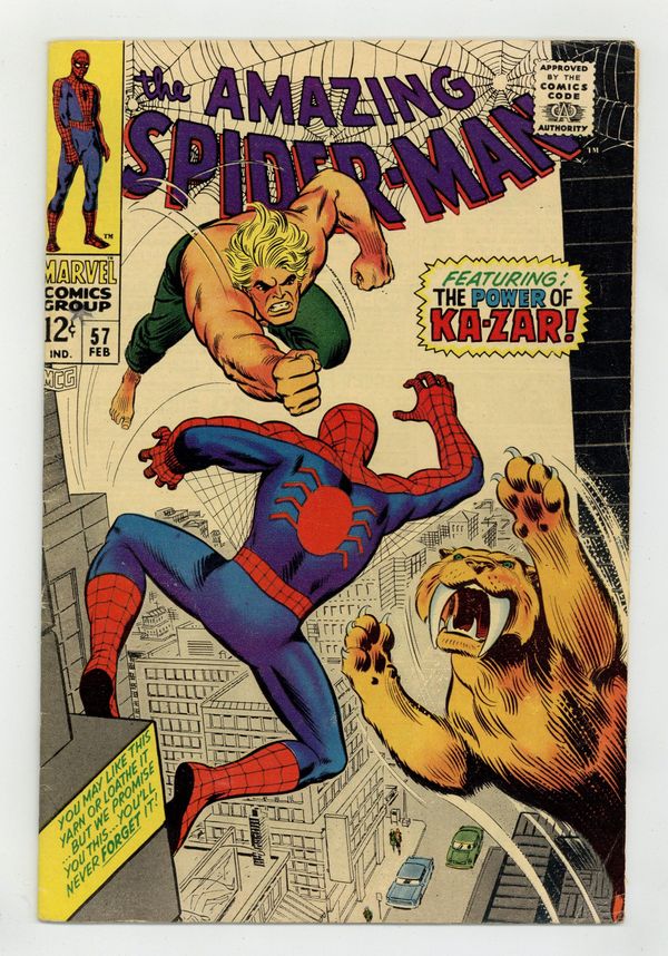 "The Coming of Ka-Zar!" Part 1 of 2. Guest-starring Ka-Zar. Script by Stan Lee. Pencils by John Romita and Don Heck. Inks by Mike Esposito (as Mickey Demeo). Cover by John Romita. The news is good and bad for the Amazing Spider-Man. First the good...the web-slinger helped defeat Doc Oc at the end of last issue. Next the bad...he still has amnesia! So the wondrous wall-crawler is swinging around Manhattan not knowing who he is or where he lives. What a quandary! Meanwhile, Lord Kevin Plunder (akaKa-Zar) arrives in New York City with Zabu. And the first person he bumps into is J. Jonah Jameson! True to form JJJ convinces Ka-Zar that Spider-Man is a menace! And the Lord of the Jungle sets out to bring the web-slinger to justice! When Ka-Zar finds the web-spinner...the rhubarb begins! Atfirst Spider-Man has the advantage, but then the big cat enters the fray! Will Zabu send the wall-crawler to a watery grave? Cameo appearances by Aunt May, Anna Watson, John Jameson, Captain Stacy, Gwen Stacy, and Harry Osborn. (Notes: This issue is the first meeting between Spider-Man and Ka-Zar. The letters page includes a letter from comics historian Peter Sanderson.) 36 pages. Cover price $0.12. Grade: VG+ 4.5 explanation of grade Condition: Used (collectible)