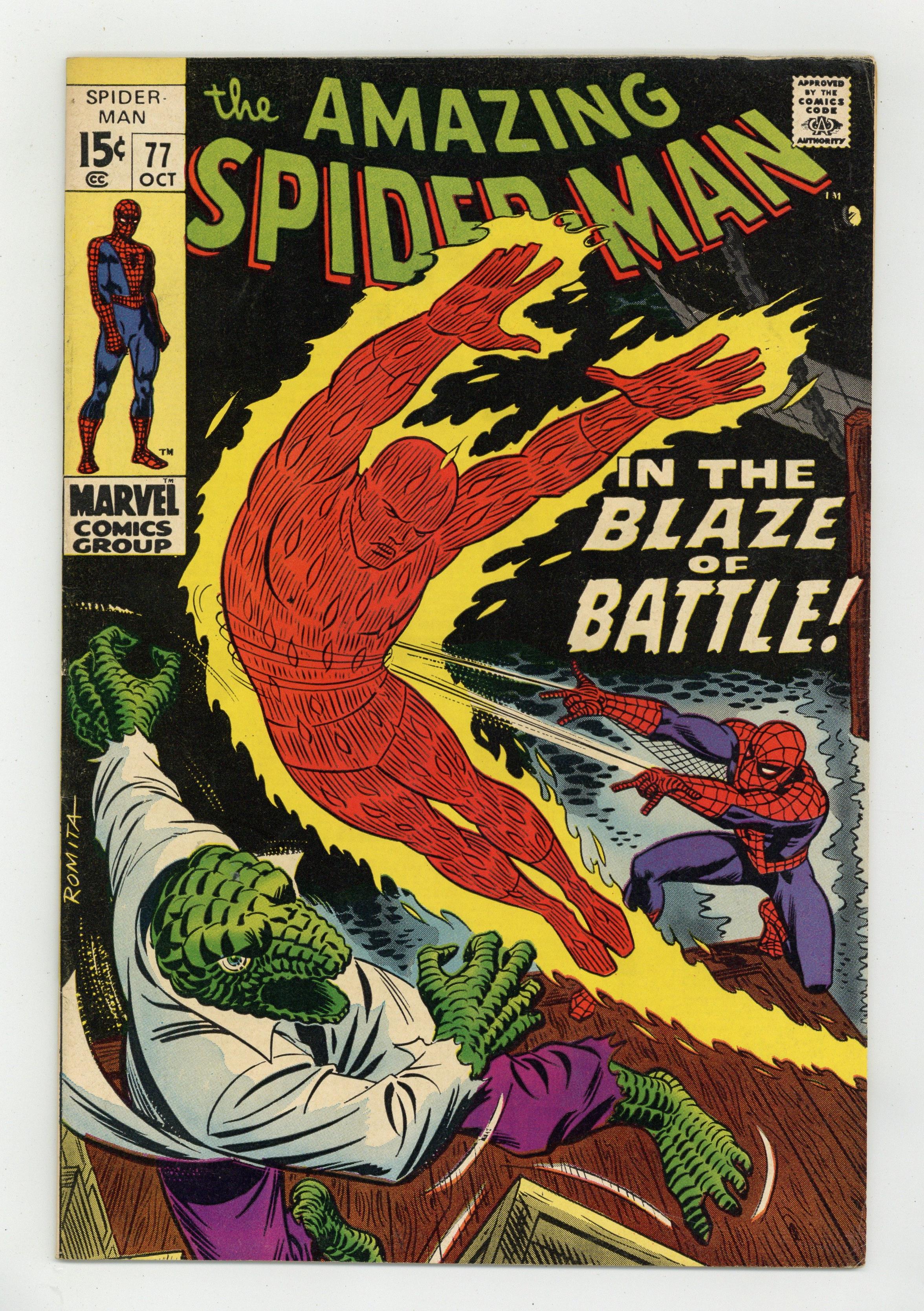 "In the Blaze of Battle!" Part 2 of 2. Guest-starring the Human Torch. Plot by John Buscema. Script by Stan Lee. Art by John Buscema (layouts) and Jim Mooney (finishes). Cover by John Romita. In the nick of time, the Human Torch arrives to interrupt the Lizard's attack! The web-slingershould be overjoyed, but he's not! Because Johnny Storm might accidentally hurt the Lizard during the fight. So as a result a confusing three-way battle takes place across the city! The Human Torch vs. the Lizard; Spider-Man vs. the Human Torch; and the Lizard vs. Spider-Man! How can thewall-crawler make sure everyone walks away a winner? Appearances by Billy Connors and Martha Connors. (Notes: Spider-Man tangles with the Lizard again in Amazing Spider-Man 102. The letters page includes a letter from comics writer Don McGregor. This issue was reprinted in Marvel Tales #58.) 36 pages. Cover price $0.15. Grade: FN- 5.5 explanation of grade Condition: Used (collectible)
