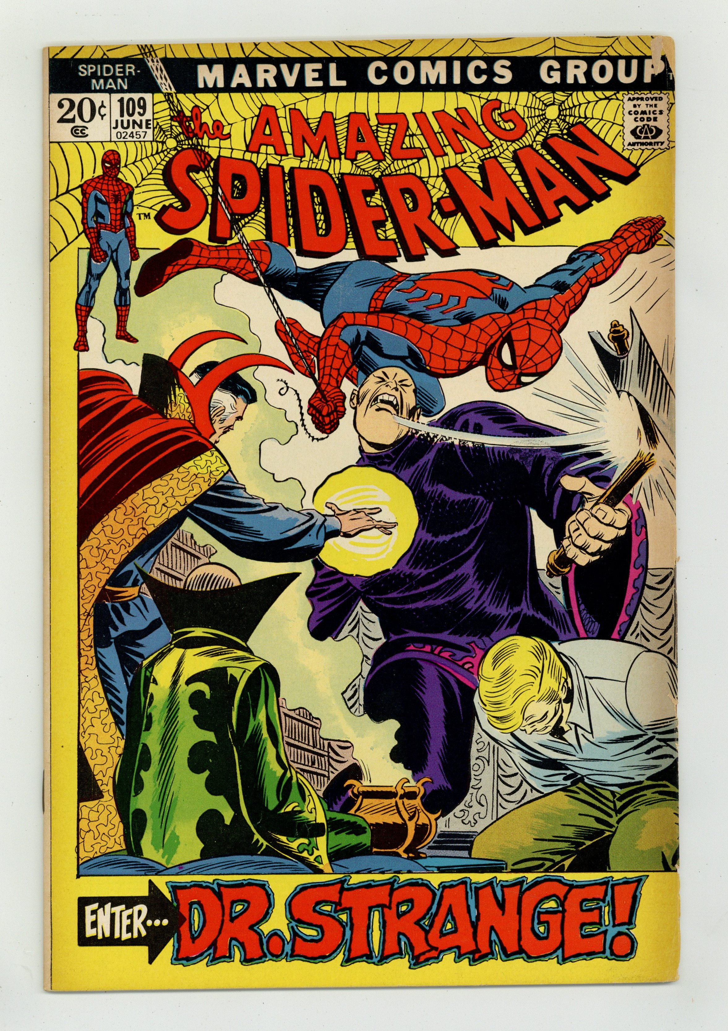 "Enter: Dr. Strange!" Part 2 of 2. Guest-starring Doctor Strange. Script by Stan Lee. Pencils by John Romita. Inks by John Romita and Tony Mortellaro (backgrounds). Cover by John Romita. The web-slinger frantically swings through the city trying to pick up a signal from his spider tracer! The amazing one tossed the tracer on the tall man who abducted Flash last issue. So, find the tracer...find Flash! But instead, Spider-Man picks up a message from the Master of the Mystic Arts! Somehow Dr. Strange knows were Flash has been taken. The duo rushes to the location, and the battle to rescue Flash begins! Cameo appearances by Gwen Stacy, Harry Osborn, Aunt May, and Sha Shan. (Notes: Spider-Man and Dr. Strange meet again in Marvel Team-Up #21. This story was reprinted in Marvel Tales #88.) 36 pages. Cover price $0.20. Grade: VG+ 4.5 explanation of grade Condition: Used (collectible)