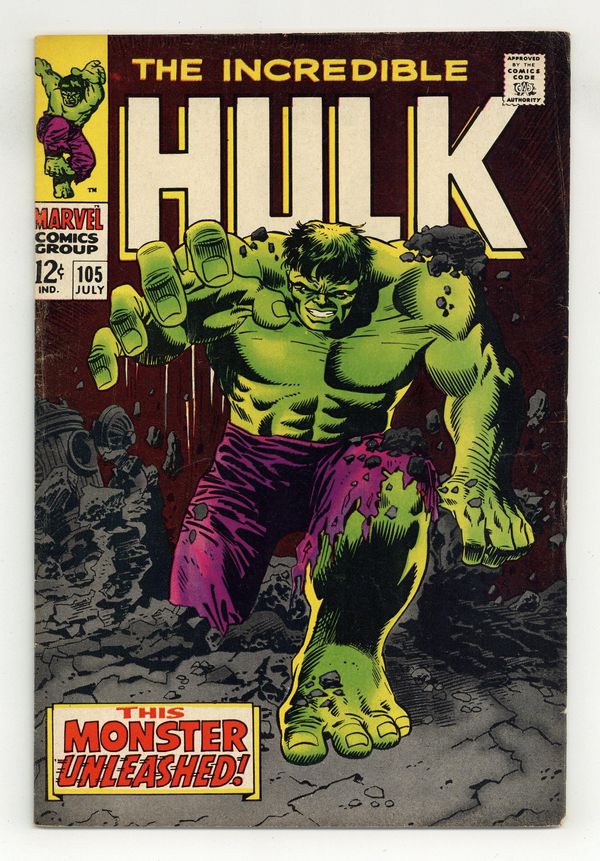 Cover pencils by Marie Severin, inks by Frank Giacoia. This Monster Unleashed!, script by Bill Everett and Roy Thomas, pencils by Marie Severin, inks by George Tuska; Prowling New York with Betty in his clutches, the Hulk transforms back into Banner just in time to be shot in the leg by a pair of thugs; The product of a nuclear test conducted by the U.S. and captured by the Chinese, the Missing Link is brought to New York and unleashed to wreak havoc; Of course, the dangerously radioactive monster crosses paths with the wounded Hulk and the two battle; Mr. Fantastic creates a Hulk-stopping weapon designed by Banner and Talbot takes the machine to hunt for the jade giant; Not realizing that he is fighting a dangerous foe, Talbot shoots the Hulk with the weapon turning him back into Banner just as the Missing Link begins another assault. House ad for the Spectacular Spider-Man #1, art by John Romita. 36 pgs. $0.12. Cover price $0.12. Grade: VG+ 4.5 explanation of grade Condition: Used (collectible)