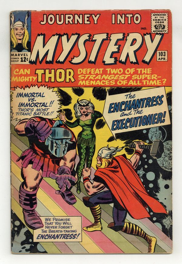 Cover pencils by Jack Kirby, inks by George Roussos. "The Enchantress and the Executioner!", script by Stan Lee, pencils by Jack Kirby, inks by Chic Stone; Loki and Odin conspire to end Thor's infatuation with Jane Foster by sending the Enchantress to seduce him away from his mortal love; The heavy handed Executioner fouls things up and the mission is unsuccessful; features the first appearance of the two title characters. "Poor Oscar" text story. "To Live Forever!", script by Stan Lee (plot) and Larry Lieber (script), pencils by Larry Lieber, inks by Chic Stone; In a future where capital punishment has been abolished, the maximum sentence is 90 years imprisonment; A brilliant scientist decides to find a way to make himself immortal, so he may commit crimes with impunity, but turns himself into a rock. This issue also has a statement of ownership: average print run 318,413; average paid circulation 187,740. "Thor's Mission to Mirmir!", script by Stan Lee, pencils by Jack Kirby, inks by Chic Stone; Thor must reach Mirmir to tell him that Odin has decided it is time to create the human race. 36 pgs., full color. Cover price $0.12. Grade: GD+ 2.5 explanation of grade Condition: Used (collectible)