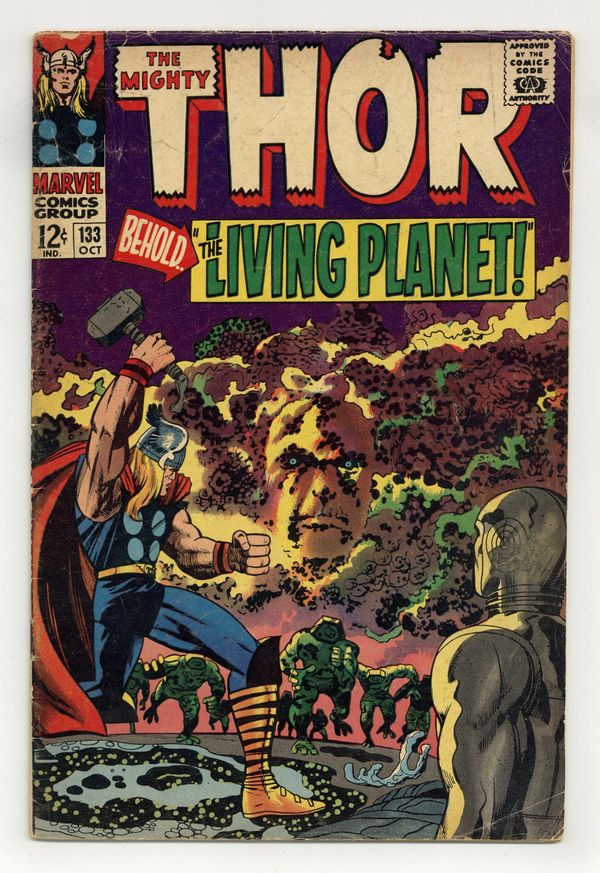 Cover pencils by Jack Kirby, inks by Vince Colletta. Ego and the Recorder guest star in "Behold...The Living Planet!", script by Stan Lee, pencils by Jack Kirby, inks by Vince Colletta; Thor wins over Ego, the Living Planet and gets Earth's freedom from the colonizers; Jane wanders into the New Men and is offered a job as a teacher in Wundagore. Bullpen Bulletins. Tale of Asgard: "Valhalla!", script by Stan Lee, pencils by Jack Kirby, inks by Vince Colletta; Harokin rides the Black Stallion of Doom to Valhalla. 36 pgs., full color. $0.12. Cover price $0.12. Grade: GD/VG 3.0 explanation of grade Condition: Used (collectible)