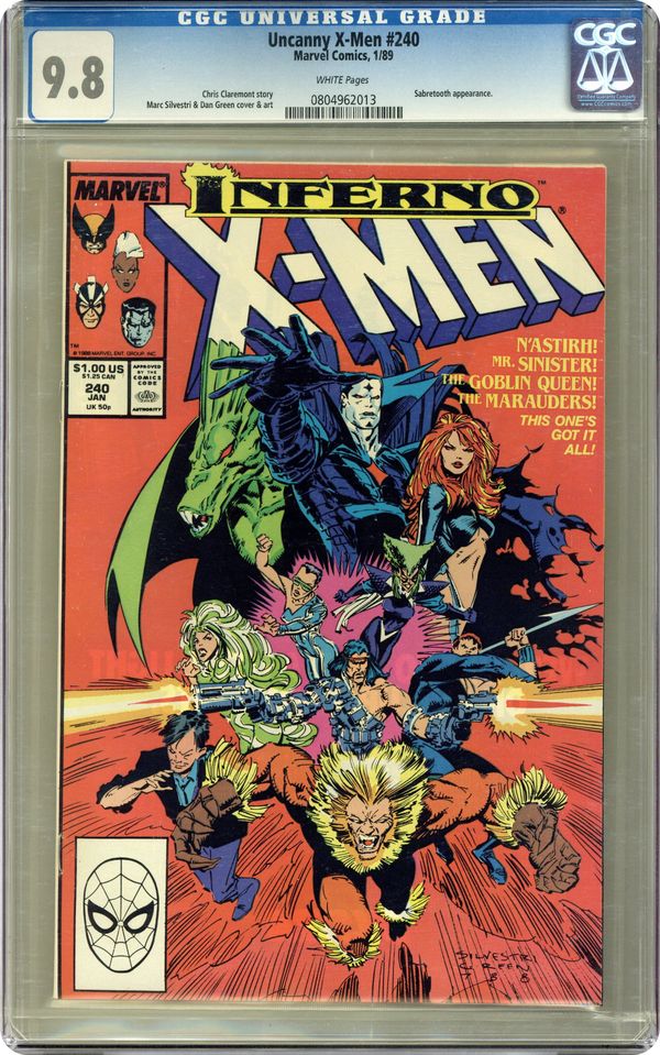 Direct Edition. Inferno: Part 1 of 7 - "Strike the Match!" Story by Chris Claremont. Art and cover by Marc Silvestri and Dan Green. Something strange is happening to New York City, and something strange is happening to Madelyne Pryor. But before the X-Men can figure that out, they have an old score to settle with their old friends - the Marauders! 36 pgs. Cover price $1.00. Grade: CGC 9.8 explanation of grade Condition: Used (collectible)