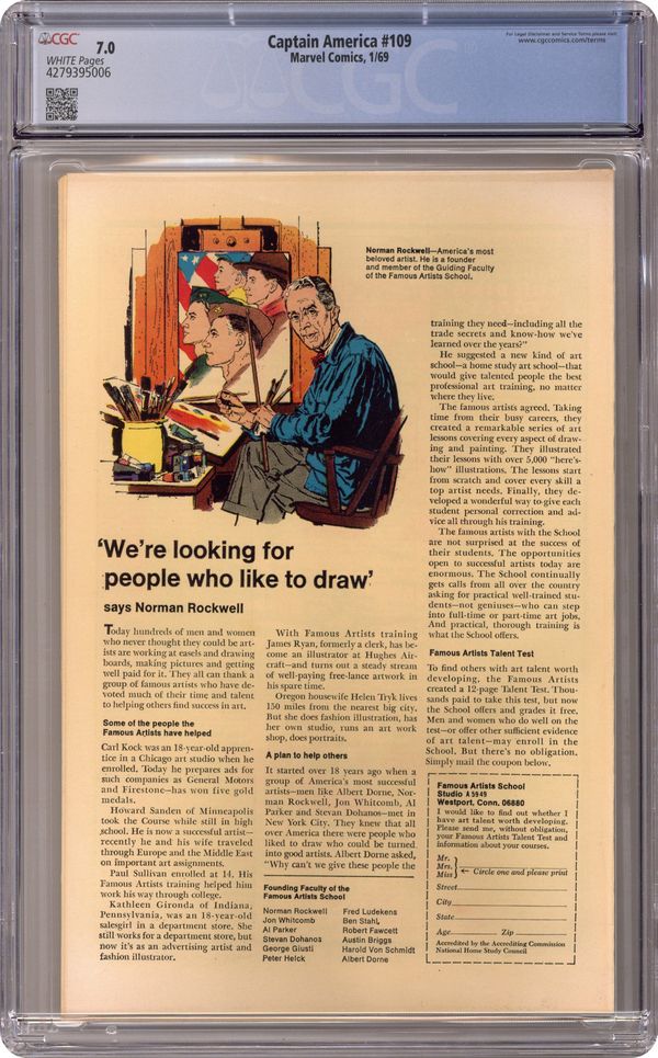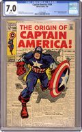 Ended Oct 26 2023 Winning Bid $168 1st printing. Cover pencils by Jack Kirby, inks by Syd Shores . "The Hero That Was!", script by Stan Lee, pencils by Jack Kirby, inks by Syd Shores; Captain America tells Nick Fury his origin, and about how guilty he is over Buckys death; During WWII, Steve Rogers applied for the military, but couldnt pass the physical; He enters a program and is given super soldier formula, which makes him bigger and stronger; Cap battles a Nazi. Letter to the editor from comics writer Don McGregor. NOTE: JC Penney reprint exists with a Stridex ad on the back cover and Marvel Legends AF reprint exists with Red/White Marvel logo in the bottom right corner of front cover. 36 pgs., full color. $0.12. Cover price $0.12. Grade: CGC 7.0 explanation of grade Condition: Used (collectible)