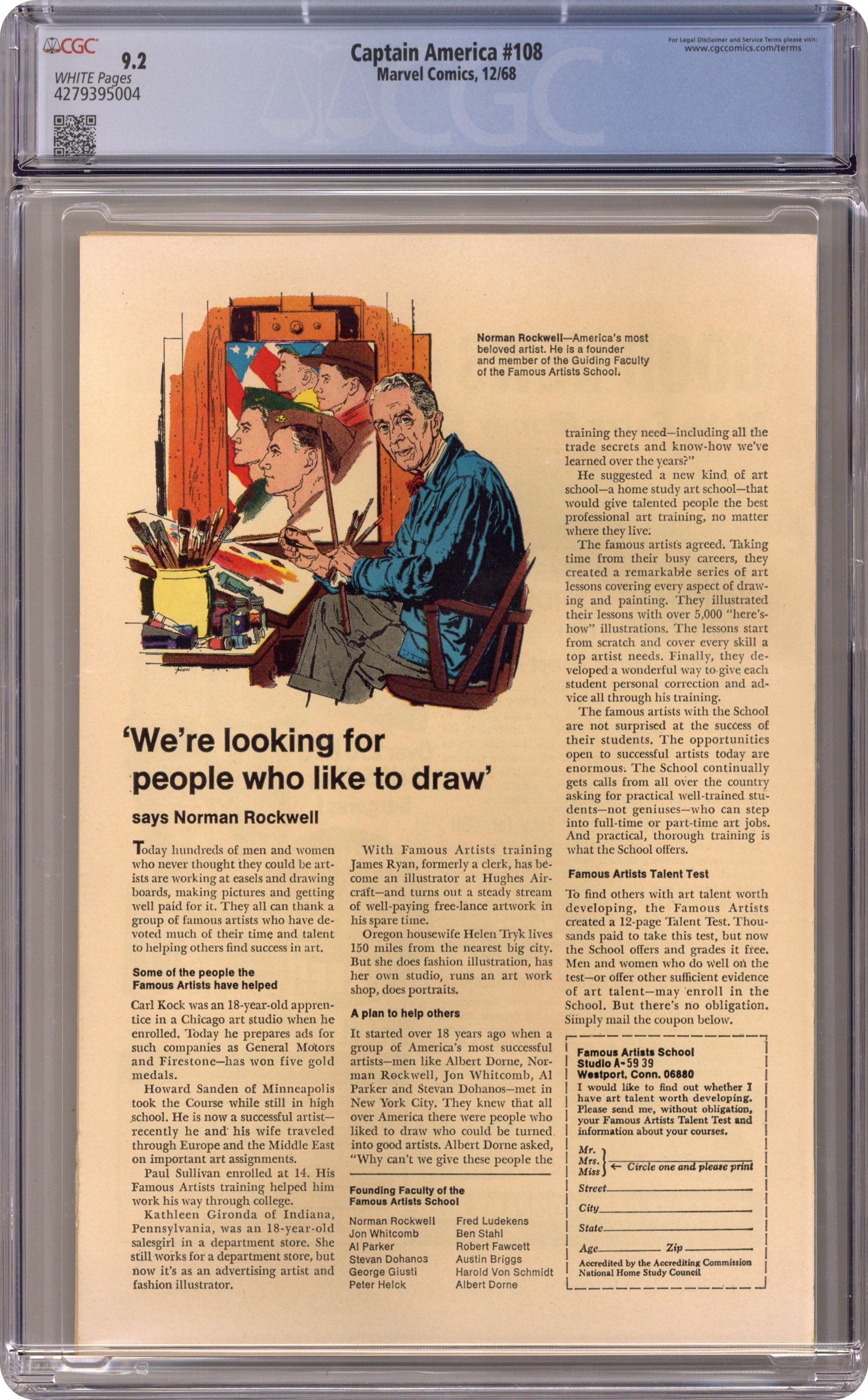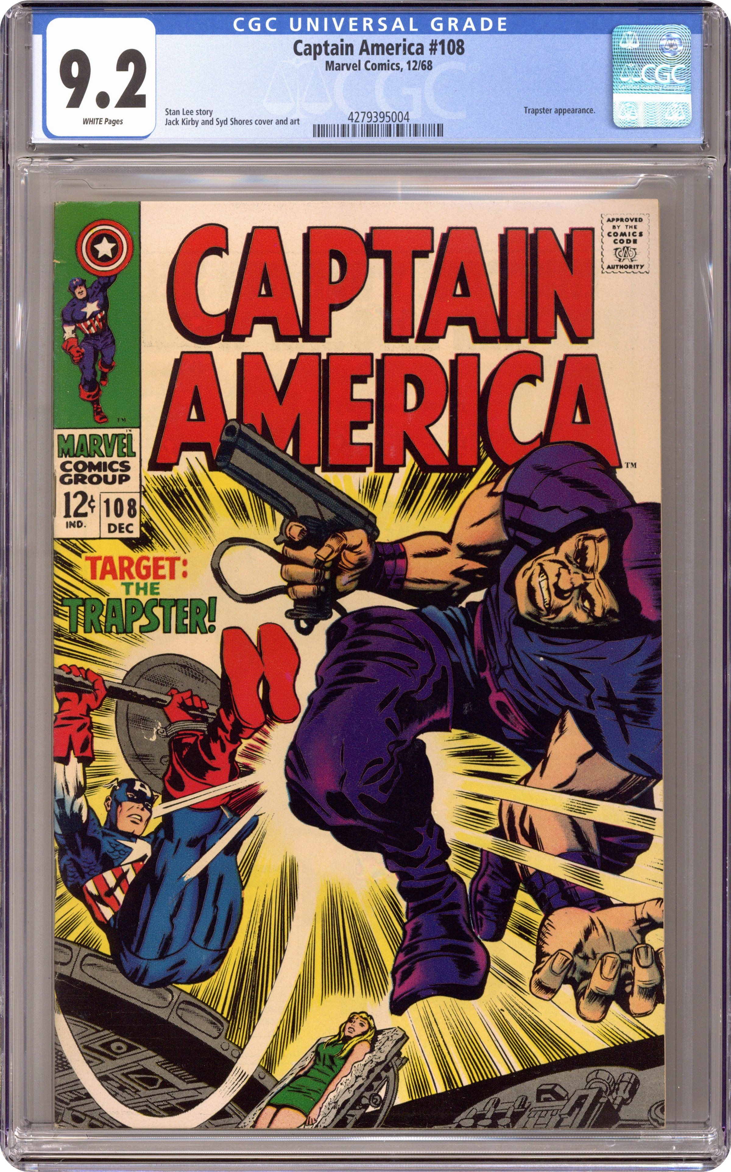 Ended Oct 29 2023 Winning Bid $115 Cover pencils by Jack Kirby, inks by Syd Shores . "The Snares of the Trapster!", script by Stan Lee, pencils by Jack Kirby, inks by Syd Shores; A SHIELD agent asks Captain America to help with a mission; Cap refuses at first, but then the agent tells him it involves rescuing Sharon Carter; Unknown to Captain America, Sharon is the prisoner of the Trapster, who is trying and to get information out of her regarding Project Fireball; Cap fights the Trapster. Ad for Spectacular Spider-Man. 36 pgs., full color. $0.12. Cover price $0.12. Grade: CGC 9.2 explanation of grade Condition: Used (collectible)