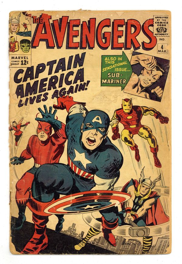 Ended Jan 6 2024 Winning Bid $425 Cover pencils by Jack Kirby, inks by George Roussos. Captain America Joins... The Avengers!, script by Stan Lee, pencils by Jack Kirby, inks by George Roussos; Namor attacks a group of eskimos and throws their idol into the sea. When the ice melts, the figure trapped within turns out to be Captain America, in suspended animation since the end of World War II; The Avengers rescue Cap and return to New York. An alien figure turns our heroes to stone. When Cap and Rick Jones track him down, the alien agrees to restore the Avengers if they agree to help him recover his broken space ship in return; When doing so, the Avengers are attacked by Namor. Roster includes: Thor, Giant-Man, Wasp, Iron Man and Captain America. Rick Jones and Sub-Mariner appearances. First modern appearances of Captain America and Bucky. First appearance (shadowed cameo of face) of the first Baron Zemo. 36 pgs. $0.12. Cover price $0.12. Grade: PR 0.5 explanation of grade Condition: Used (collectible)