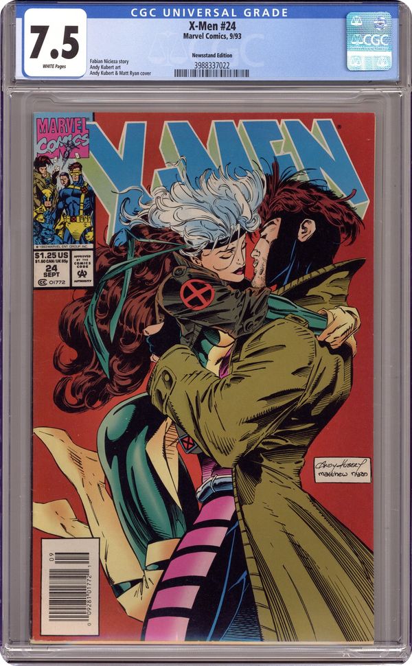 Ended Oct 14 2023 Winning Bid $21 Direct Edition. Cover pencils by Andy Kubert, inks by Matt Ryan. Digging Deeper Between Hope and Sorrow, script by Fabian Nicieza, pencils by Andy Kubert, inks by Bill Sienkiewicz; Jubilee mourns Ilyana; Rogue and Gambit go on a date; Betsy and Kwannon try to decide who's who; Cont. from Uncanny X-Men #303; Cont. in Uncanny X-Men #304. 36 pgs. $1.25. Cover price $1.25. Grade: CGC 7.5 explanation of grade Condition: Used (collectible)