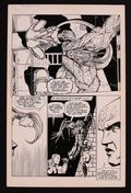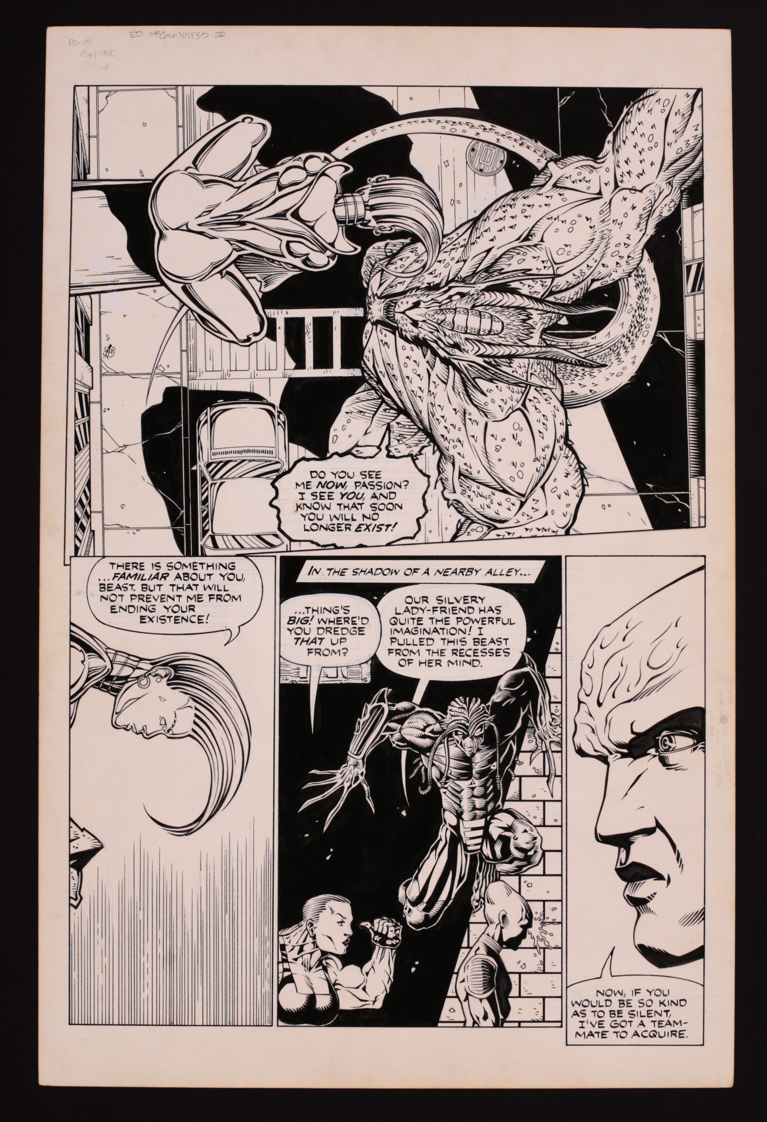 Future superstar Ed McGuinness' first published issue sees agent of the Dante Corp Bogy (a monstrous shapeshifter) attempting to recruit Passion, an artificial construct of liquid metal. McGuinness impresses even in his first work with a gorgeous half splash that gives a unique perspective on Passion's conversation with the beast. Pencil and ink on comic art board. 11" x 17", B&W.