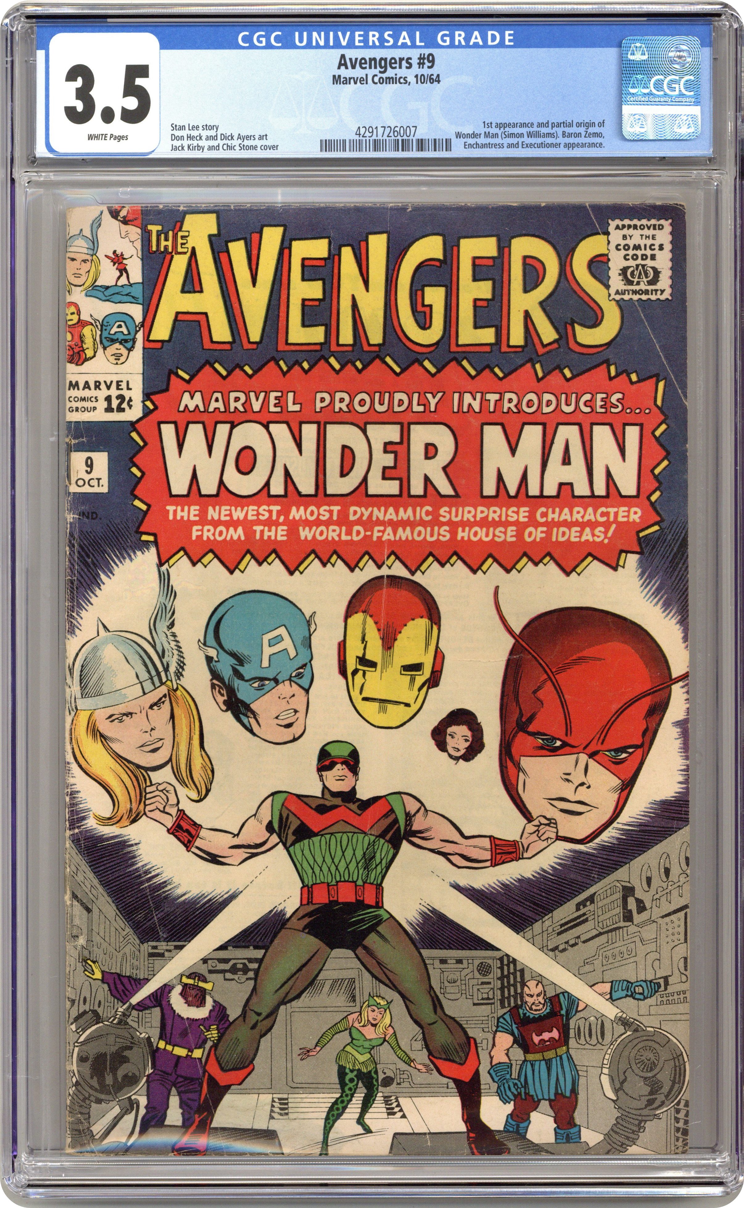 Ended Nov 14 2023 Winning Bid $138 Cover pencils by Jack Kirby, inks by Chic Stone. First appearance of Wonder Man in "The Coming of the... Wonder Man!", script by Stan Lee, pencils by Don Heck, inks by Dick Ayers; Baron Zemo and the Masters of Evil transform Simon Williams into Wonder Man and send him to infiltrate the Avengers; Instead, he winds up allying with them at the cost of his own life. Roster: Captain America, Thor, Iron Man, Giant-Man, and the Wasp. Villains: Executioner, the Enchantress, and Baron Zemo. Cameo appearance by Bucky. 36 pgs., full color. $0.12. Cover price $0.12. Grade: CGC 3.5 explanation of grade Condition: Used (collectible)