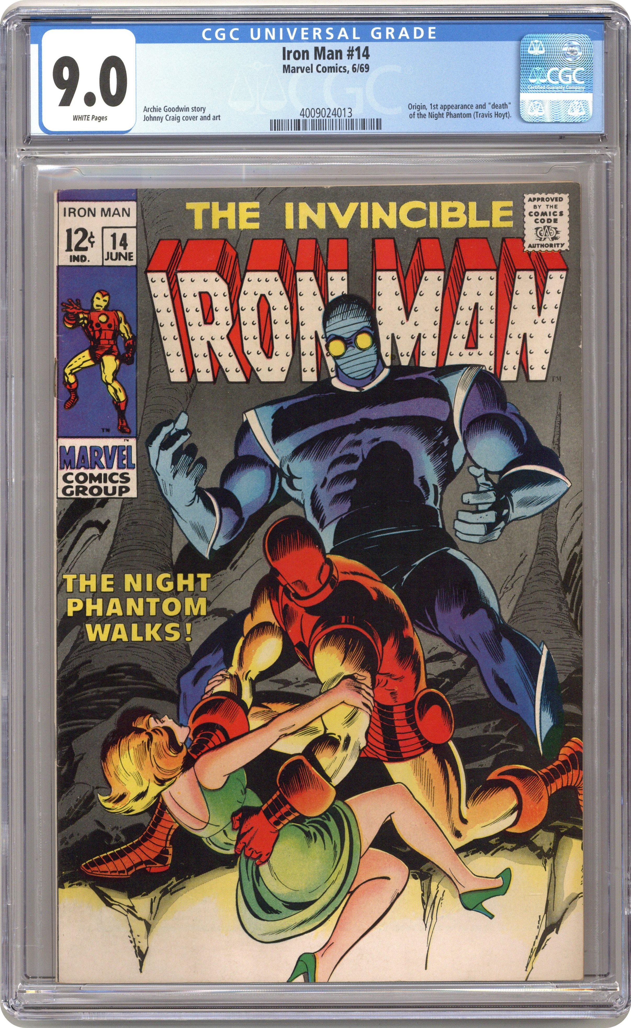Ended Oct 12 2023 Winning Bid $56 "The Night Phantom Walks!" Script by Archie Goodwin. Pencils and Inks by Johnny Craig. Cover by Johnny Craig. Tony Stark travels to a Caribbean Island where a mysterious creature has been sabotaging the Stark Industries facilities. The local islanders think that a supernatural being is performing the acts of terror, but Tony suspects something else. In an underground cavern, Iron Man battles the treacherous Night Phantom to save Janice Cord one more time. Can the golden avenger prevent Janice from falling into the radioactive pool? First appearance of the Night Phantom. 32 pages Cover price $0.12. Grade: CGC 9.0 explanation of grade Condition: Used (collectible)