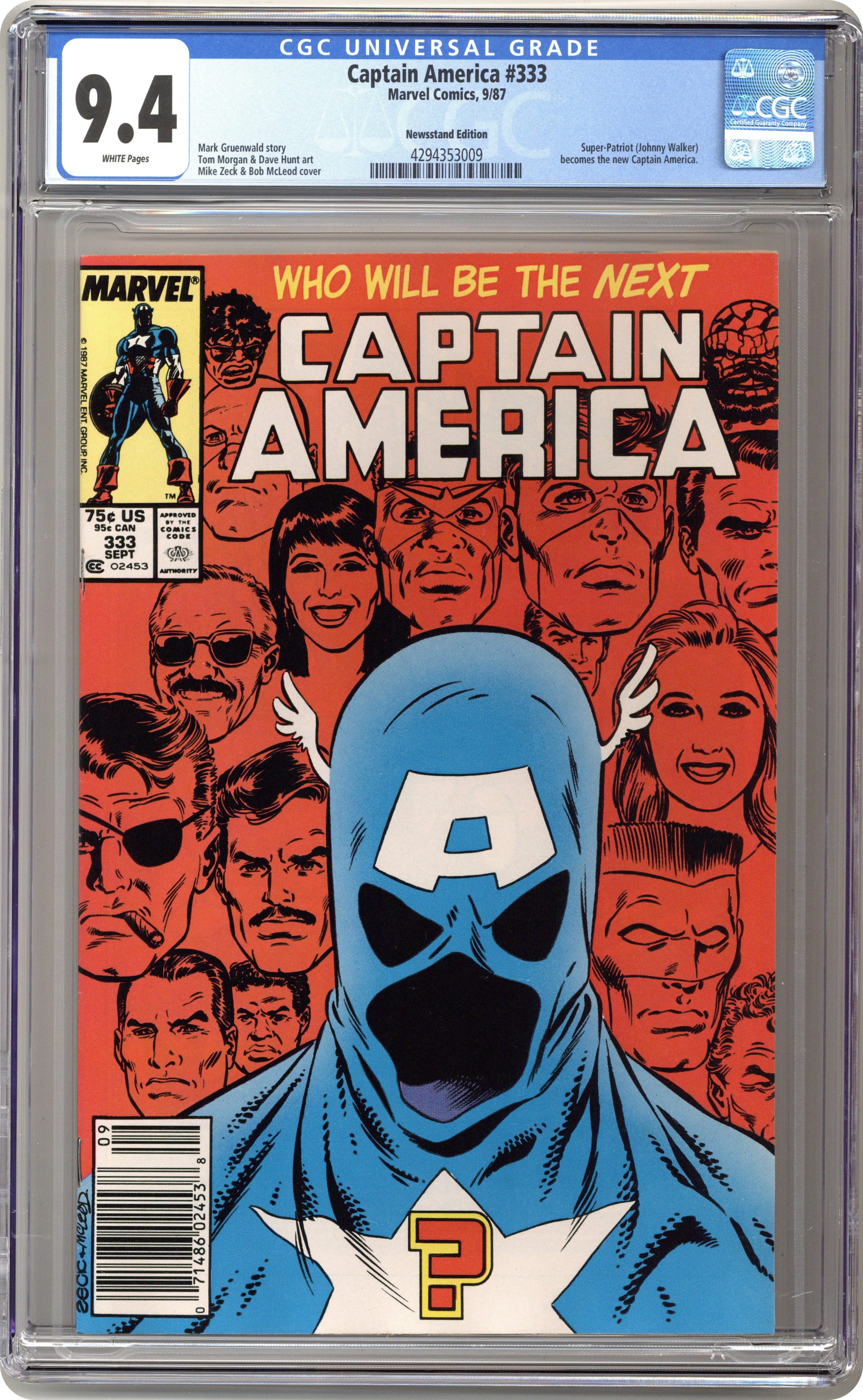 Ended Dec 11 2023 Winning Bid $46 Newsstand Edition. Super Patriot (John Walker) becomes new Captain America. "The Replacement" Story by Mark Gruenwald. Art by Tom Morgan and Dave Hunt. Cover by Mike Zeck and Bob McLeod. The Commission is shocked by Steve Rogers' resignation and immediately begins a search for a new Captain America. Commission member Val Cooper has an idea: how about the Super-Patriot? John Walker accepts and becomes the next Captain America! (Note: Stan Lee is depicted on the left side of the cover.) 36 pages Cover price $0.75. Grade: CGC 9.4 explanation of grade Condition: Used (collectible)