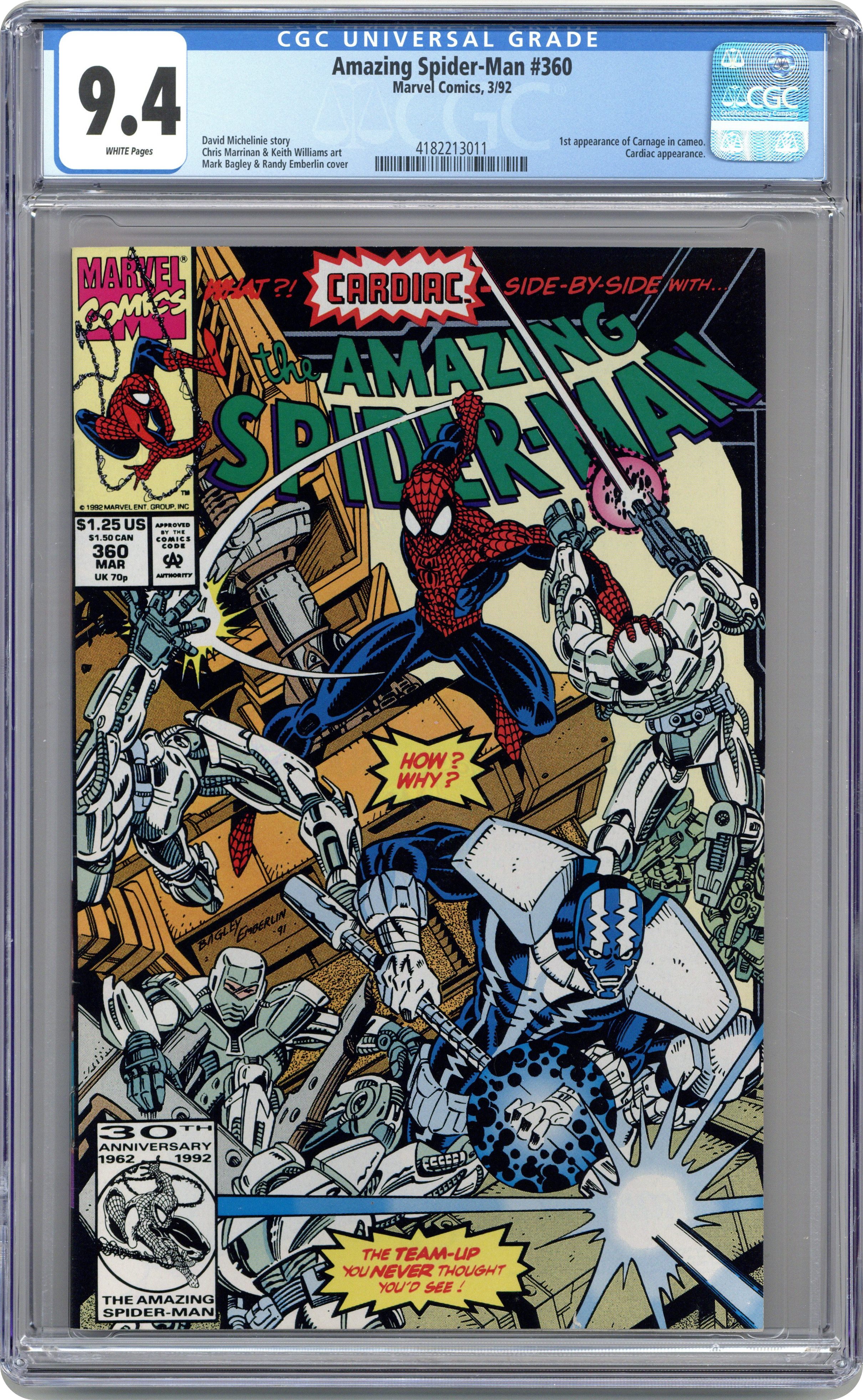 Ended Oct 3 2023 Winning Bid $24 Direct Edition. "Death Toy!" Part 2 of 2. Script by David Michelinie. Pencils by Chris Marrinan. Mark Bagley. Inks by Keith Williams. Cover by Mark Bagley and Randy Emberlin. At the Tech-Toy warehouse, Cardiac and the wall-crawler come to a meeting of the minds about their pursuits of justice! Perhaps it's possible for them to work together after all! The next evening at Stane International, Spider-Man and Cardiac team up to stop the illegal manufacturing of military weapons! Could this be the beginning of a beautiful friendship? Not quite! Meanwhile, a new blood-hued super-villain makes his first savage kill...the first of many! Cameo appearances by Carnage, Mary Jane Watson, Ben Urich, Joy Mercado, and J. Jonah Jameson. Origin of Cardiac. (Notes: Cardiac returns in Amazing Spider-Man 376. The letters page contains a statement of ownership: average print run 470,075; average paid circulation 340,977.) 36 pages. $1.25 cover price. Cover price $1.25. Grade: CGC 9.4 explanation of grade Condition: Used (collectible)