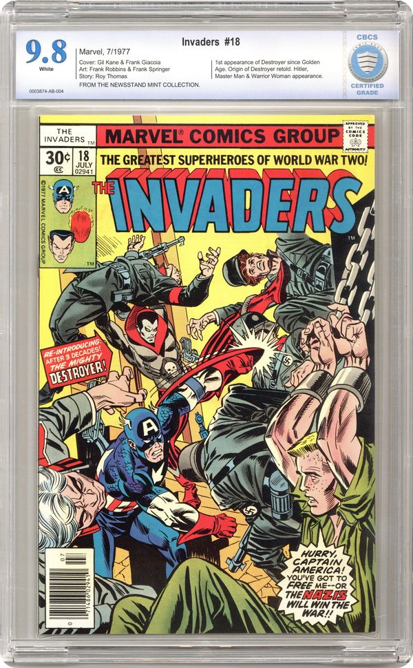 Ended Oct 16 2023 Winning Bid $84 Part 3 of 6 - "Enter: The Mighty Destroyer!" Guest-starring the Destroyer. Written by Roy Thomas. Art by Frank Robbins and Frank Springer. Can even the Invaders survive the combined might of Master Man and Warrior Woman? Maybe with a little help from a mysterious masked hero from the Golden Age of comics. 32 pages FC Cover price $0.30. Grade: CBCS 9.8 explanation of grade Condition: Used (collectible)