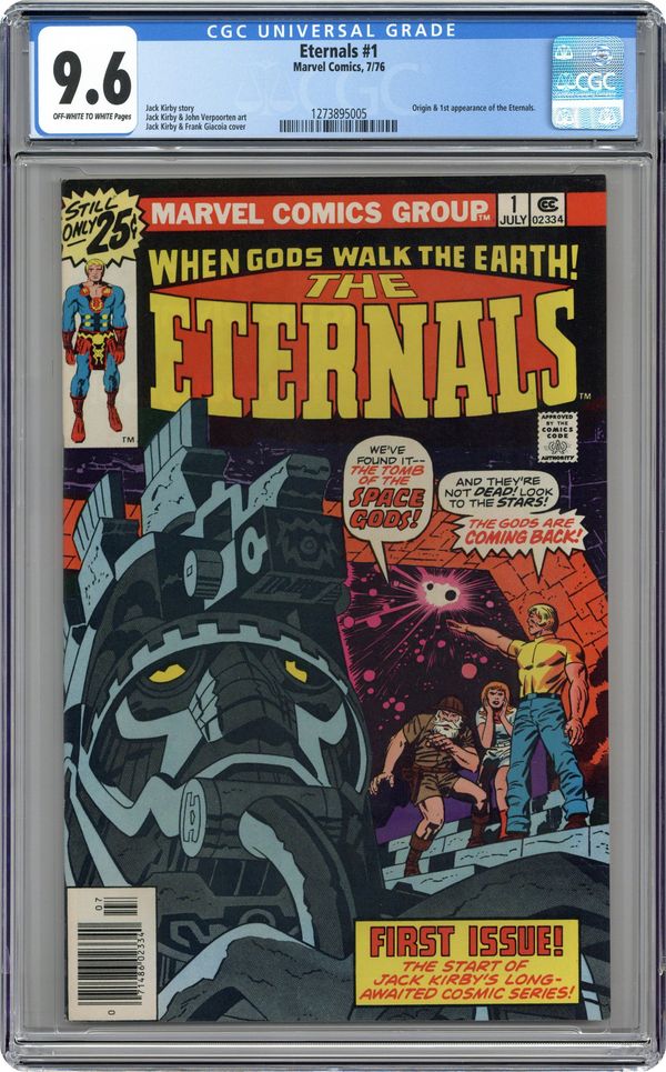 Ended Oct 20 2023 Winning Bid $140 "The Day of the Gods." Written by Jack Kirby. Pencils by Jack Kirby. Inks by John Verpoorten. What if all the stories were true? All myths...all the legends... What if all the stories about gods and monsters were true? For archeologist Doctor Damian and his daughter Margo, those legends are about to become reality. The gods are real and they've lived among us for centuries. 1st appearance of Ikaris, Makkari, Kro and the Eternals as a team . 36 pages, full color. Cover price $0.25. Grade: CGC 9.6 explanation of grade Condition: Used (collectible)
