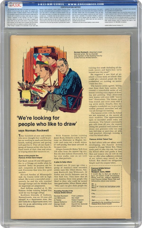 Ended Oct 29 2023 Winning Bid $391 Cover pencils by Jack Kirby, inks by Syd Shores and Joe Sinnott. First issue, continued from Tales of Suspense 99. Origin of Captain America retold, as originally depicted in Avengers #4, in "This Monster Unmasked!", script by Stan Lee, pencils by Jack Kirby, inks by Syd Shores; Baron Zemo orders Agent 13, who is posing as female spy Irma Kruhl, to execute Captain America and Black Panther; Zemo plans to use a solar ray to destroy America; Agent 13, Captain America and Black Pather battle Zemos robot, Destructon. Brief Nick Fury appearance. Cameos by the Avengers and the Sub-Mariner. 36 pgs., full color. $0.12. Cover price $0.12. Grade: CGC 7.0 explanation of grade Condition: Used (collectible)