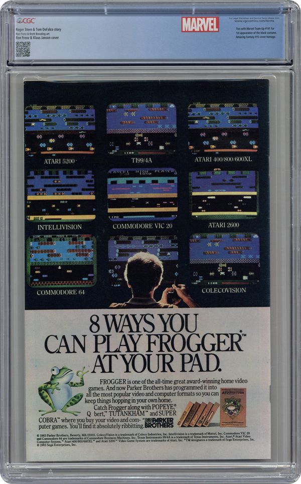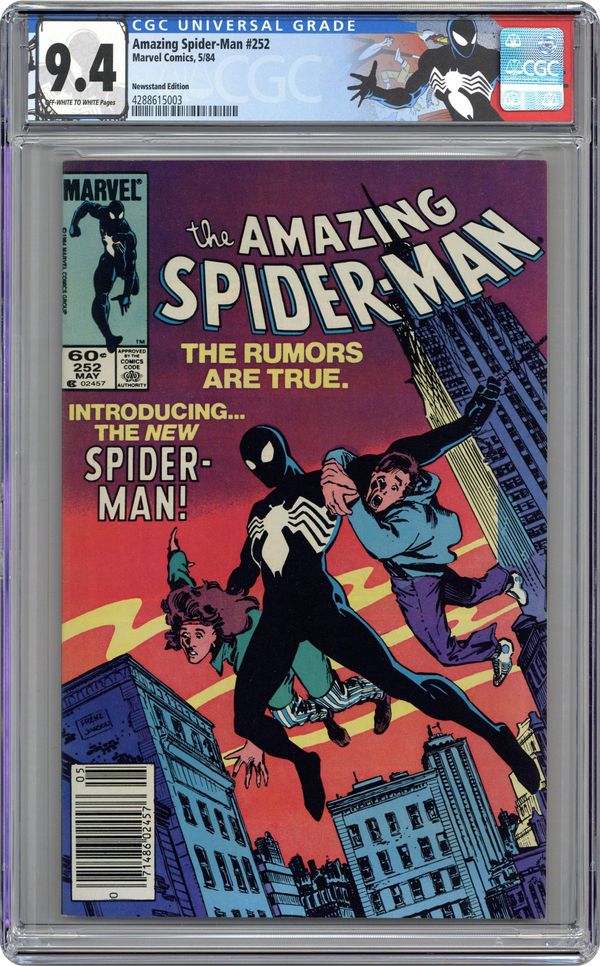 Ended Oct 12 2023 Winning Bid $220 Newsstand Edition. First appearance of Spider-Man's new black (alien symbiote) costume in "Homecoming!" Plot by Roger Stern. Script by Tom DeFalco. Pencils by Ron Frenz (breakdowns) and Brett Breeding (finishes). Cover by Ron Frenz and Klaus Janson. One of the landmark issues of the Amazing Spider-Man! With a brilliant flash of light in Central Park, the wondrous wall-crawler is back! And he looks a whole lot different! Wow, a new costume! What happened during the Secret Wars on the Beyonder's world? The ominous truth will be revealed to both the readers and the web-slinger in the days and weeks ahead! Cameo appearances by the Black Cat, Dr. Curt Connors, J. Jonah Jameson, Joe Robertson , Aunt May, Captain America, Captain Marvel, Hawkeye, Iron Man, Thor, and the Wasp. (Notes: Marvel Age 12 contained sketches of the new costume two months prior to the publication of this issue. Spidey's new costume was also unveiled in Marvel Team-Up 141 and Spectacular Spider-Man 90. The first issue of the (1984) Marvel Super Heroes Secret Wars Limited Series was published the same month as Amazing Spider-Man 252. The web-slinger discovers his new costume in issue 8 of the limited series. The Frenz-Janson cover is a tribute to the iconic cover of Amazing Fantasy 15. This story was reprinted in Marvel Tales 266. The letters page contains a statement of ownership: average print run 470,527; average paid circulation: 241,762. 36 pgs. Cover price $0.60. Grade: CGC 9.4 explanation of grade Condition: Used (collectible)
