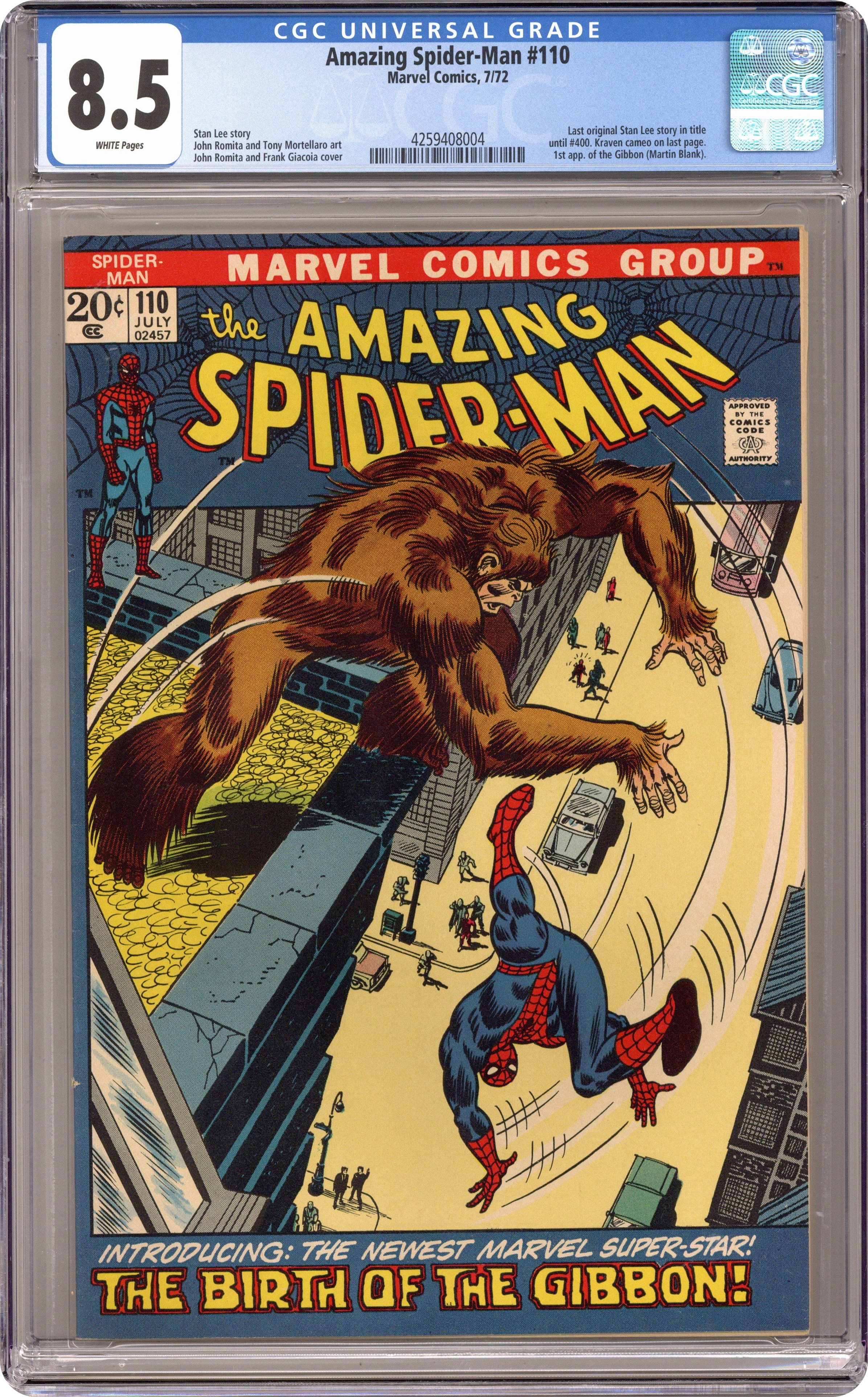 Ended Oct 31 2023 Winning Bid $76 First appearance of the Gibbon in "The Birth of the Gibbon!" Part 1 of 2. Script by Stan Lee. Pencils by John Romita. Inks by John Romita and Tony Mortellaro (backgrounds). Cover by John Romita and Frank Giacoia. On a Manhattan rooftop, the wall-crawler has a chance meeting with a man named Martin Blank. And after he talks with Spider-Man; the tall, lanky, and athletic Martin decides to become a superhero! But when Martin (in his ape costume) meets the web-slinger again, Spider-Man laughs at his offer to become partners, and Martin is hurt. And now the Gibbon is vulnerable to becoming partners...with someone else! Origin of the Gibbon. Cameo appearances by Aunt May, Gwen Stacy, Harry Osborn, Flash Thompson, and Kraven the Hunter. (Notes: This story completes Stan Lee's extraordinary scripting run on the Amazing Spider-Man title -- which began with issue #1in 1963. The letters page includes a letter from comics writer David Michelinie. This issue was reprinted in Marvel Tales #89.) 36 pages. Cover price $0.20. Grade: CGC 8.5 explanation of grade Condition: Used (collectible)