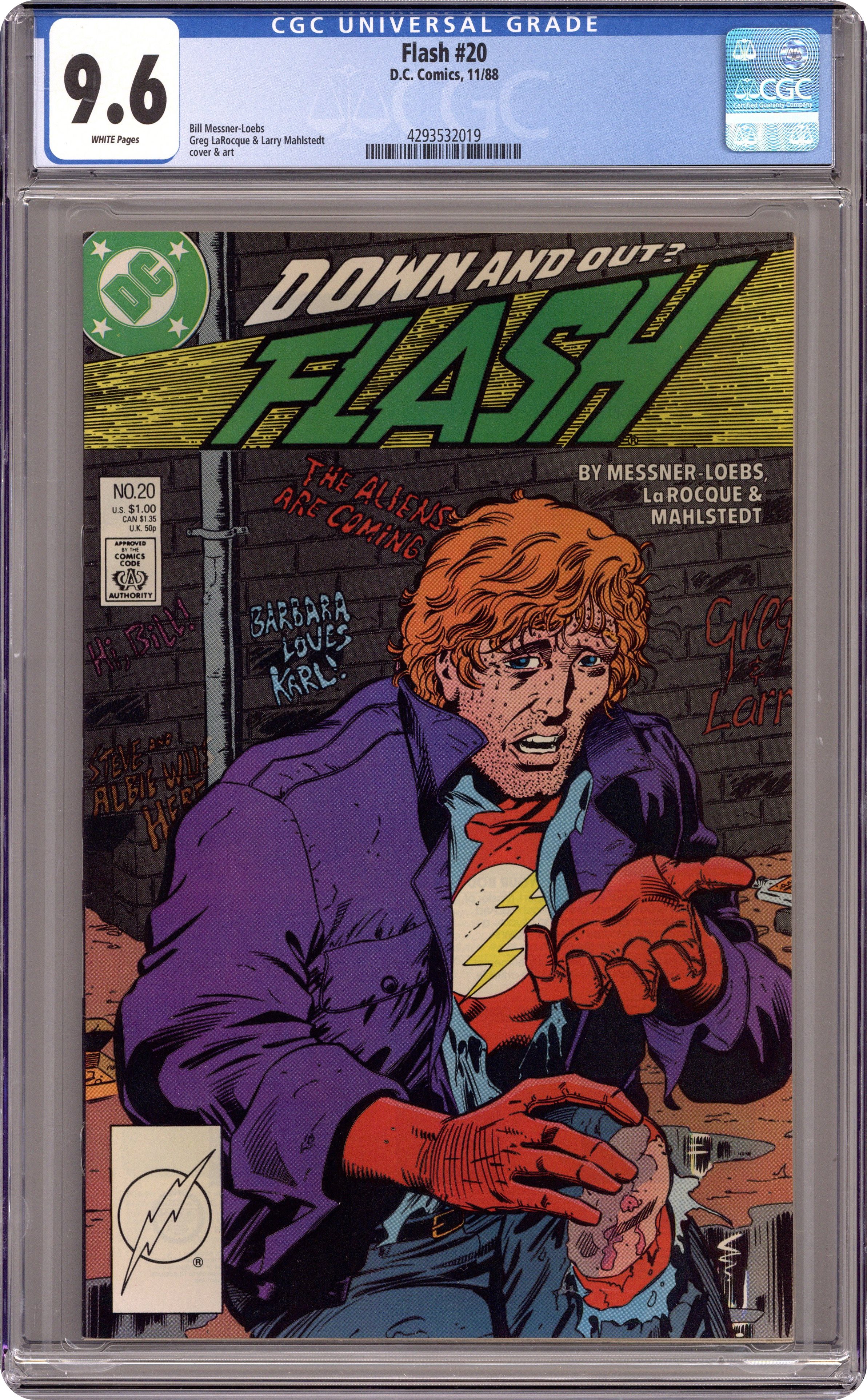Ended Sep 25 2023 Winning Bid $20 "Lost, Worthless, and Forgotten..." Wally and his mom are evicted from their apartment, reducing Wally to begging for money and food. Includes cameo by a reformed Pied Piper who is shown helping the poor. The issue leads into the Invasion! mini-series. Script by William Messner-Loebs, pencils by Greg LaRocque, inks by Larry Mahlstedt. Cover art by Greg LaRoque and Larry Mahlstedt. Cover price $1.00. Grade: CGC 9.6 explanation of grade Condition: Used (collectible)