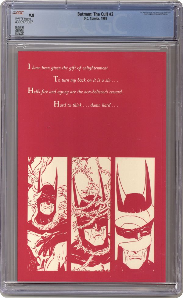 Ended Oct 13 2023 Winning Bid $64 Book two of a four-issue series, "Capture" finds Batman drugged and under the influence of Deacon Joseph Blackfire's religious cult. Prestige format, written by Jim Starlin with art by Bernie Wrightson. Cover price $3.50. Grade: CGC 9.8 explanation of grade Condition: Used (collectible)