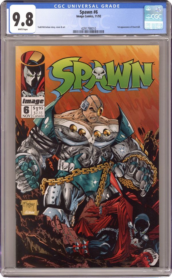 "Payback!" Part 1 of 2. 1st appearance of Overtkill. Created, story, and art by Todd McFarlane. Mafioso boss, Tony Twist, blames the new shadowy hero, Spawn, for the resent attacks on his men. Twist wants Spawn dead. Twist is a man who is used to getting what he wants. Enter: Overtkill, a cyborg killing machine who never fails. NOTE: Overtkill was created on an art training video featuring Stan Lee, Todd McFarlane, and Rob Liefeld. When Lee came up with the name "Overkill," Liefeld and McFarlane, using only the name, and within a matter of minutes, came up with the basic design for the character that would soon be known as Overtkill, a major villain in the Image Universe. - Odinson, Lone Star Comics Archivist Cover price $1.95. Grade: CGC 9.8 explanation of grade Condition: Used (collectible)