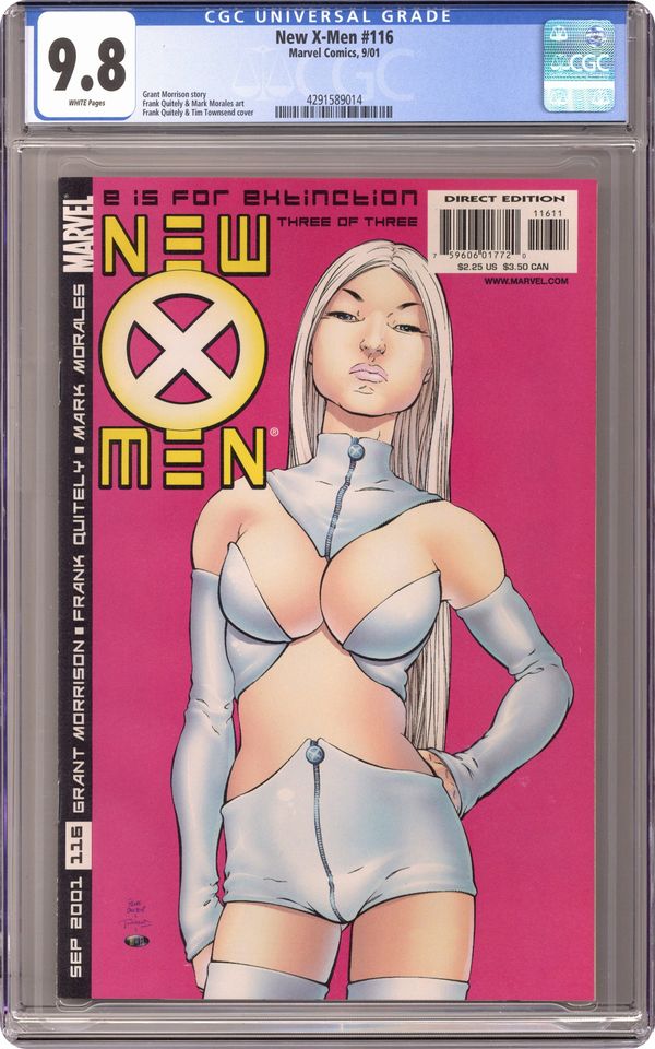 NEW X-MEN #116 cover by frank quitely grant morrison/frank quitely/tim townsend The conclusion to "E is for Extinction!" If one immensely powerful foe wasn't enough, the X-Men must also fight a supremely powerful ? and all-out evil ? new villain! It will be a battle that will cost one member of our uncanny team immensely! "Wow! This made the hairs on the back of my neck stand up with excitement! I had hoped that Grant Morrison and Frank Quitely would do a good job with this title, but this exceeds any expectations I ever had. Outstanding, highly recommended ? as in, don't miss it! Grade: A+" -Jim Shorr, Comics Buyer's Guide 7-59606-01772-0-11611 Cover price $2.25. Grade: CGC 9.8 explanation of grade Condition: Used (collectible)