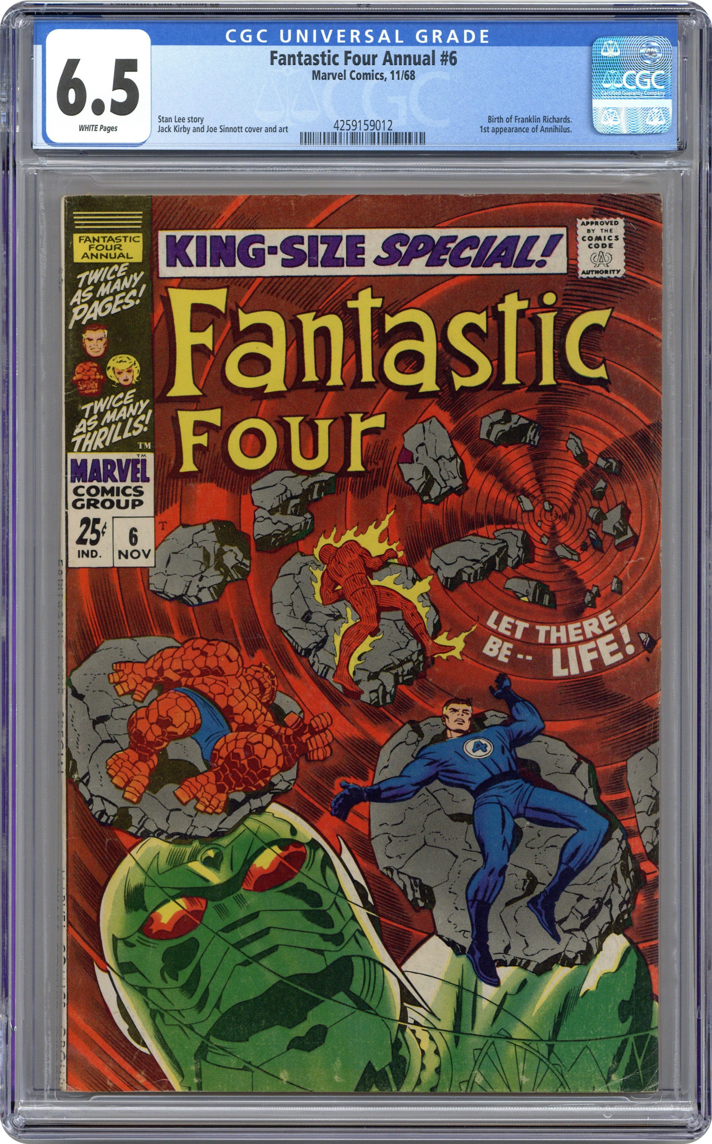 1st appearance of Franklin Richards and 1st appearance of Annihilus - "Let There Be Life!" Script by Stan Lee, pencils by Jack Kirby, inks by Joe Sinnott. Kirby/Sinnott cover. Franklin Richards is born and Annihilus is introduced! 68 pgs. Cover price $0.25. Grade: CGC 6.5 explanation of grade Condition: Used (collectible)