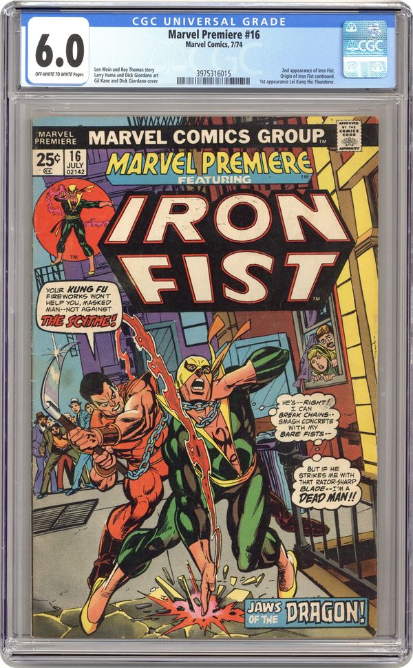 Ended Oct 2 2023 Winning Bid $28 Cover pencils by Gil Kane, inks by Dick Giordano. Heart of the Dragon!, script by Roy Thomas (co-plotter) and Len Wein, pencils by Larry Hama, inks by Dick Giordano and Klaus Janson; Danny completes his training in K'un-Lun and acquires the power of the Iron Fist but rather than partake of immortality, he decides to return to his own world and seek vengeance against his parents' killer, Harold Meachum; On arriving in New York, Danny faces assassins who are trying to collect a ten thousand dollar bounty against him. The letters page contains a text feature by Tony Isabella and Marvel Value Stamp series A # 71 (the Vision by John Buscema). 36 pgs. $0.25. NOTE: 2nd appearance and origin of Iron Fist. Cover price $0.25. Grade: CGC 6.0 explanation of grade Condition: Used (collectible)