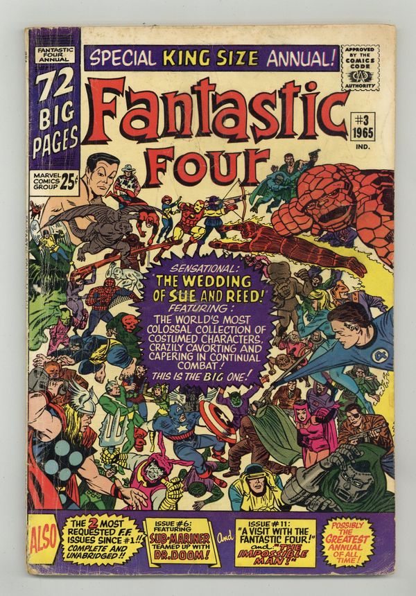 Ended Oct 10 2023 Winning Bid $21 Reed and Sue get married in a new story, "Bedlam at the Baxter Building!" Script by Stan Lee, pencils by Jack Kirby, inks by Vince Colletta. Just about everyone in the Marvel Universe, both heroes and villains, appears in this story. Steve Ditko provided the art on Spider-Man in panel 4 of page 14. This issue also reprints "Captives of the Deadly Duo" (from FF 6), "A Visit with the Fantastic Four" (FF 11), and "The Impossible Man" (FF 11). Kirby/Chic Stone cover. 76 pgs. Cover price $0.25. Grade: GD 2.0 explanation of grade Condition: Used (collectible)