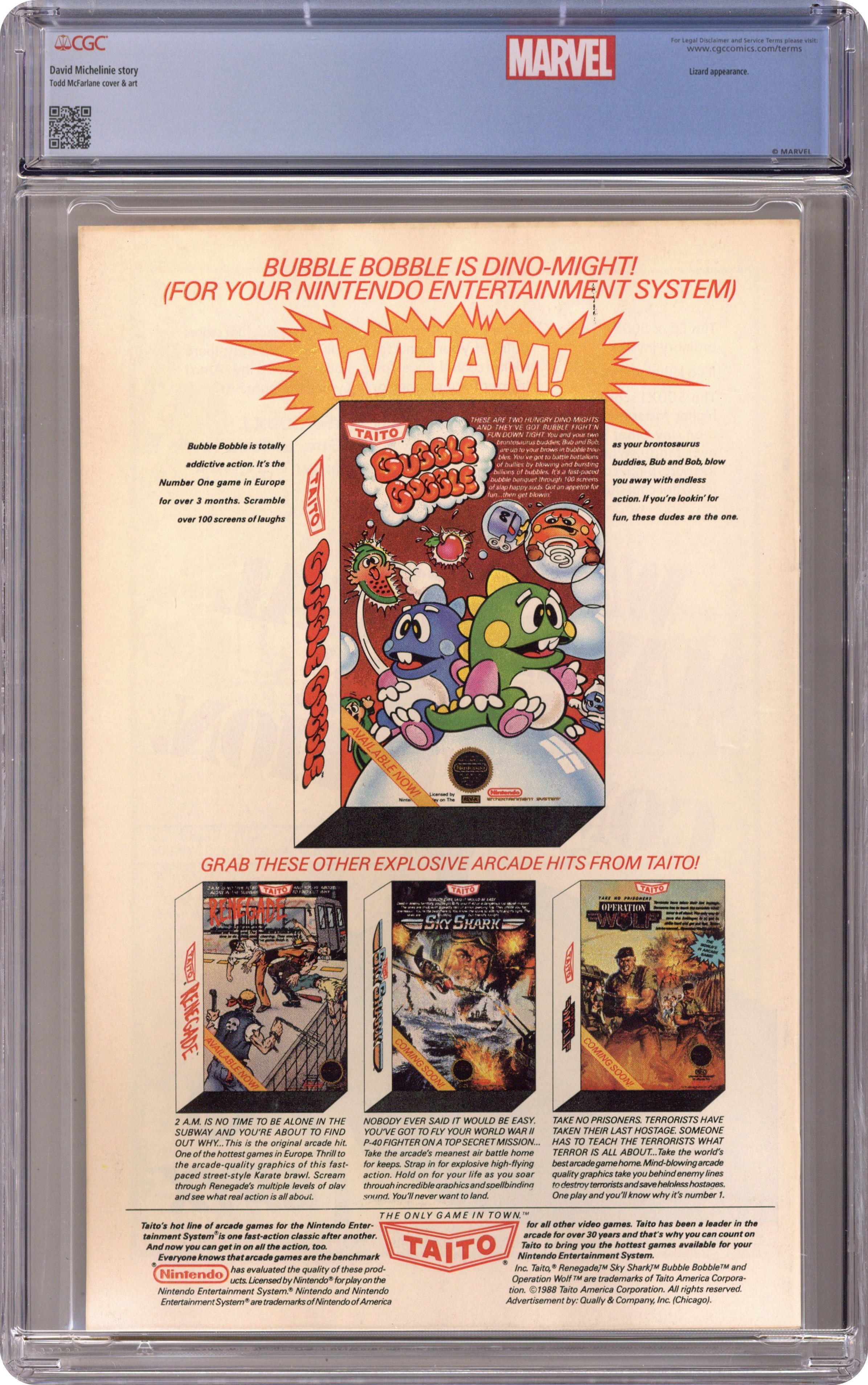 Ended Sep 26 2023 Winning Bid $33 Direct Edition. "Slithereens" Inferno crossover. Script by David Michelinie. Art by Todd McFarlane. Cover by Todd McFarlane. Story continues from Web of Spider-Man 48. Amid the rage of Inferno, Peter and Mary Jane rush to Queens to check on Aunt May! Fortunately she is okay. But back at Empire State University, Dr. Curt Connors is definitely not okay. In fact he has become the Lethal Lizard again! When Martha Connors and her son Billy stop by the ESU lab to check on Curt's welfare, the Lizard strikes! If the web-slinger can reach campus in time, he may be able to save Martha and Billy! But as far as saving the Lizard...sadly that time has long since past. Cameo appearance by Jonathon Caesar. (Note: The Lizard appears next in the first issue of the Spider-Man (1990) series.) 36 pages. Cover price $1.00. Grade: CGC 9.2 explanation of grade Condition: Used (collectible)