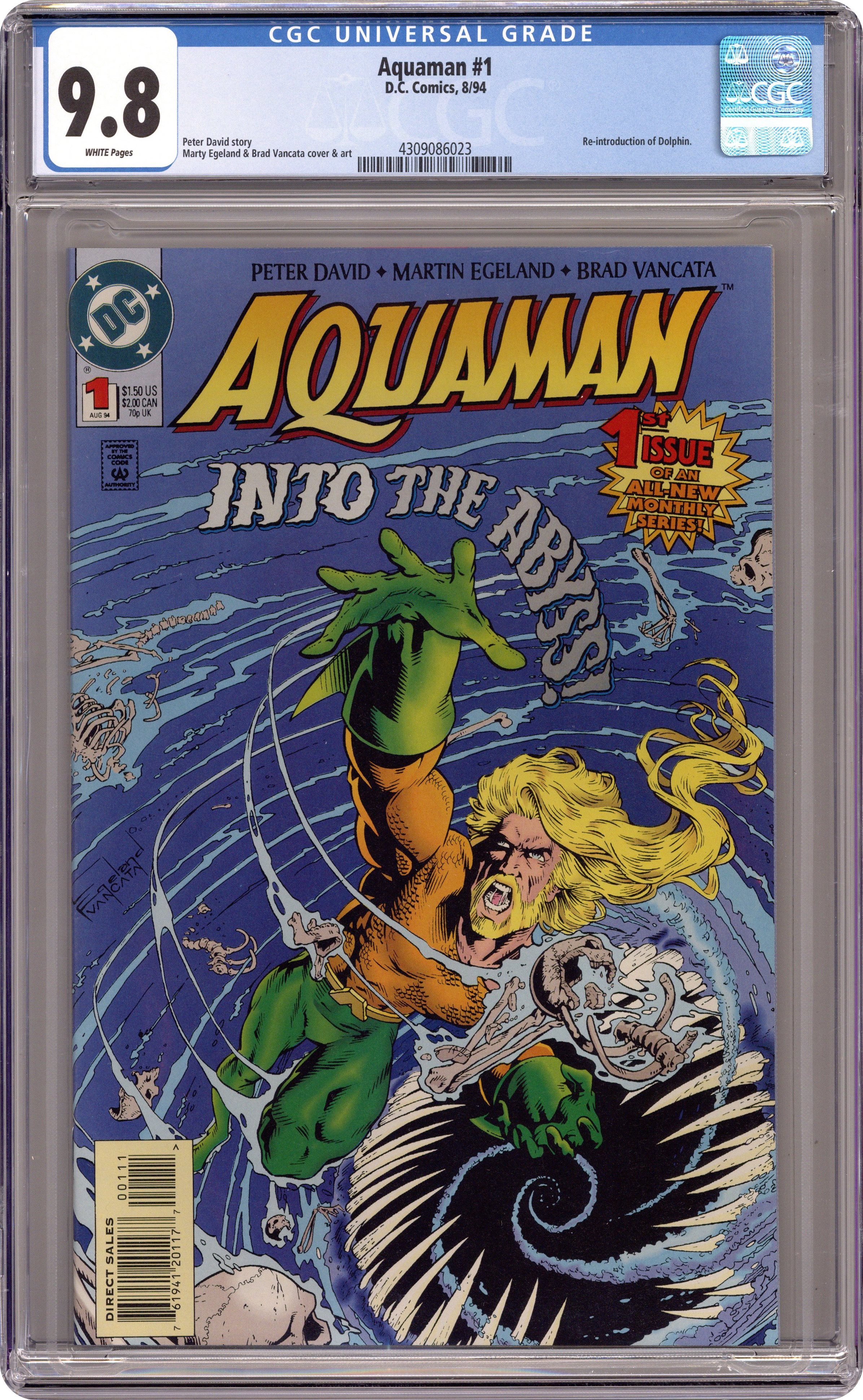 Ended Oct 7 2023 Winning Bid $41 Aquaman is back in a new series as he is haunted by intense nightmares of a dark figure claiming to be his father. Then Aqualad returns, seeking the Sea King's help in locating a sunken nuclear submarine. This leads to a fierce batle with the villainous Charybdis, whose powers are stronger than Aquaman's...and who holds hostage someone who will come to mean a lot to the Sea King - Dolphin. Written by Peter David, with art and cover by Martin Egeland and Brad Vancata. Cover price $1.50. Grade: CGC 9.8 explanation of grade Condition: Used (collectible)
