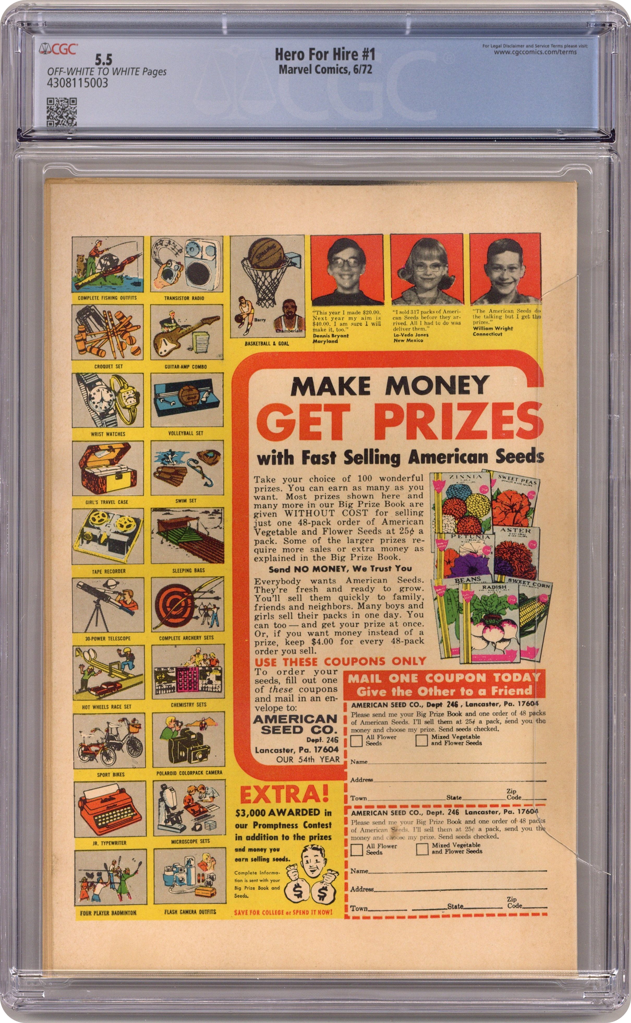Ended Oct 4 2023 Winning Bid $200 "Out of Hell--a Hero!" Script by Archie Goodwin, pencils by George Tuska, inks by Billy Graham. NOTE: Roy Thomas and John Romita are credited for their "considerable creative contributions." When Lucas, an innocent man, is sent to jail for a crime he did not commit, he decides he has nothing left to loose. Subjecting himself to unorthodox experiments, this inmate is endowed with great physical strength and nigh-unbreakable skin. No walls and bars on Earth can hold him. Now, as Luke Cage, he is known as the Hero for Hire, and he's here to clean up the "Mean Streets," one criminal at a time. Cover price $0.20. Grade: CGC 5.5 explanation of grade Condition: Used (collectible)