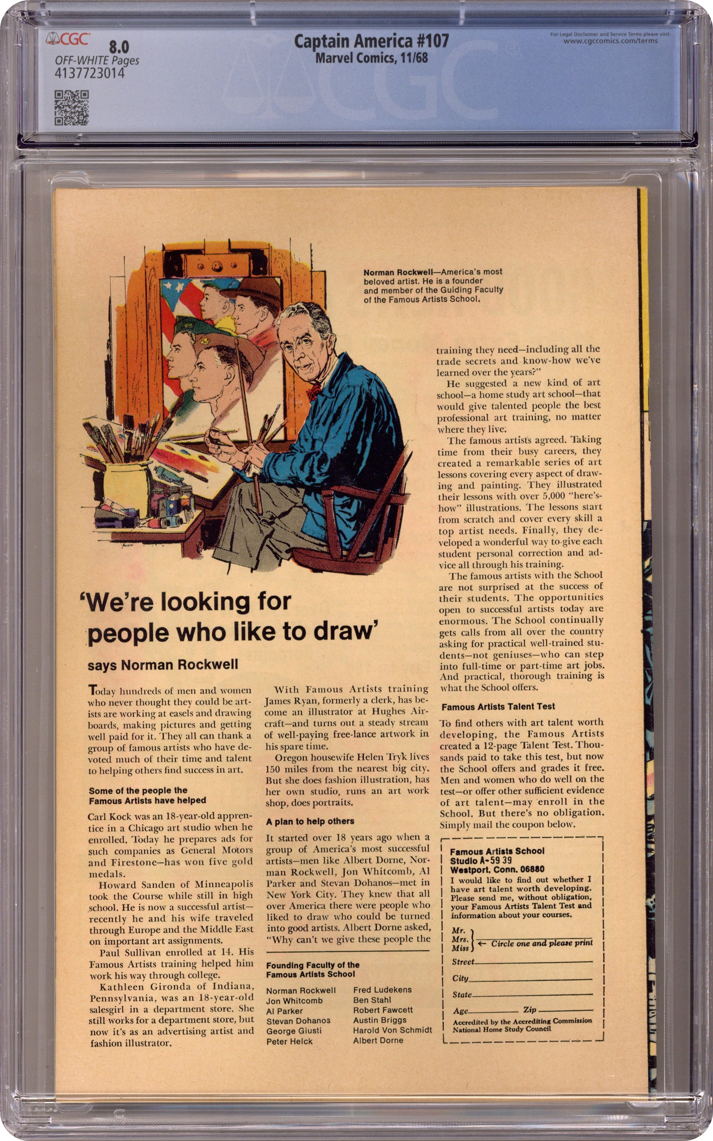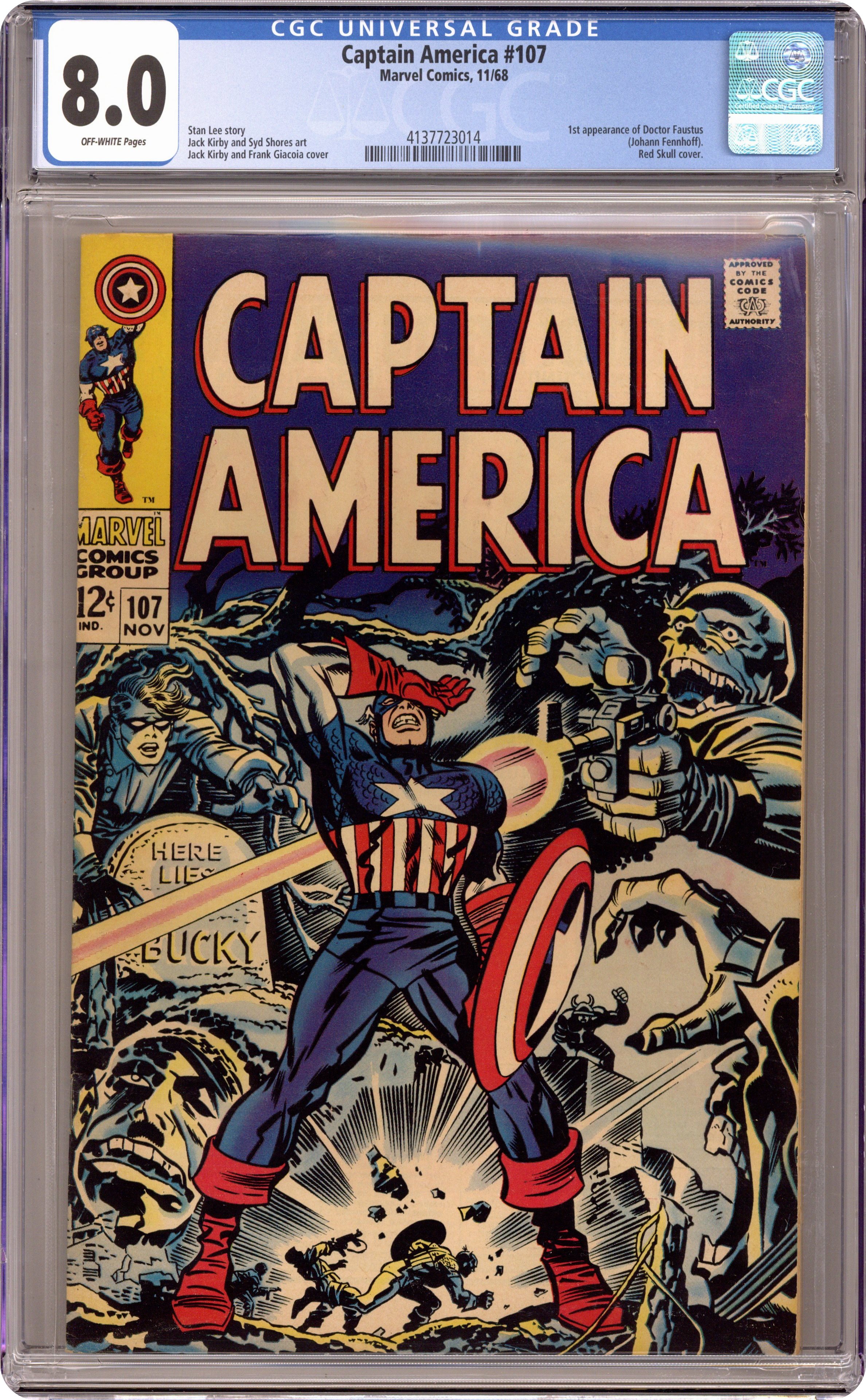 Ended Oct 17 2023 Winning Bid $92 Cover pencils by Jack Kirby, inks by Frank Giacoia. Cap faces Dr. Faustus (first appearance) in "If the Past Be Not Dead," script by Stan Lee, pencils by Jack Kirby, inks by Syd Shores; Captain American keeps dreaming that hes being chased by demonic looking Nazi soldiers; Cap comes across the grave of his old sidekick Bucky Barnes; Cap calls his psychiatrist Dr. Faustus to tell him that he keeps having the same dream; Cap battles Dr. Faustus; Cameos by the Red Skull and Bucky Barnes. Letter to the editor from comics historian Peter Sanderson Jr. 36 pgs., full color. $0.12. Cover price $0.12. Grade: CGC 8.0 explanation of grade Condition: Used (collectible)