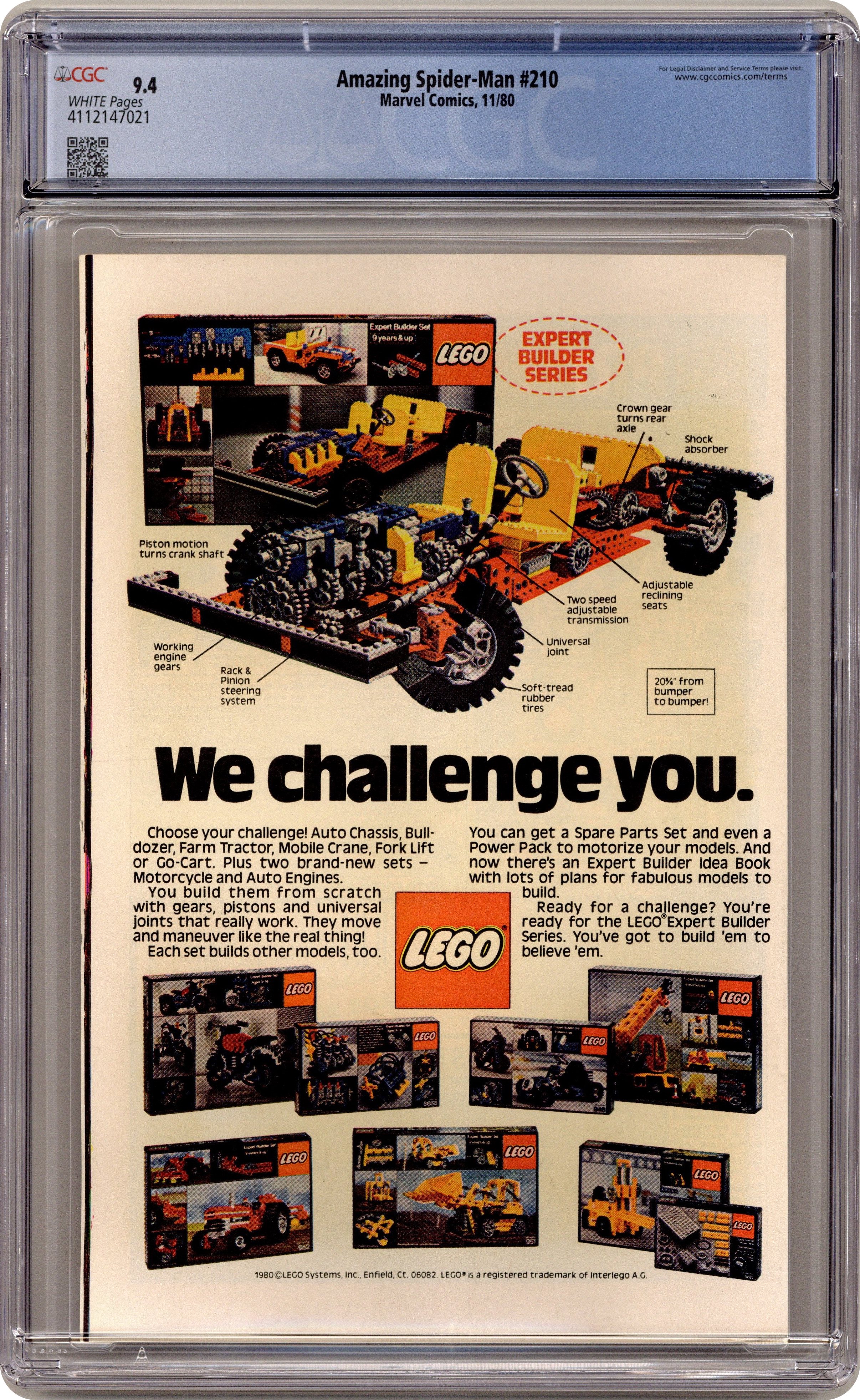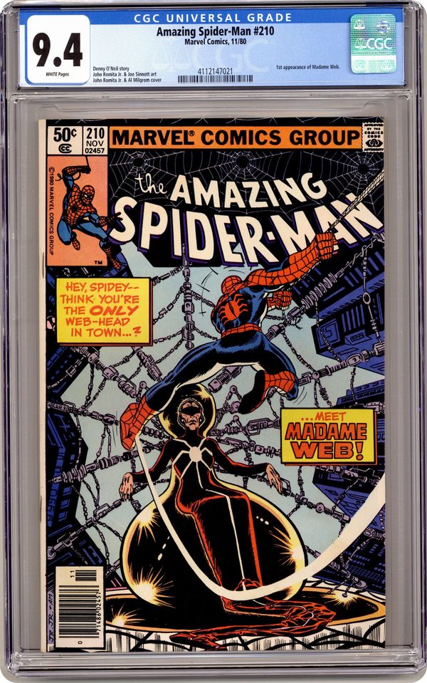 Newsstand Edition. "The Prophecy of Madame Web!" First appearance of Madame Web. Script by Denny O'Neil. Art by John Romita Jr. (breakdowns) and Joe Sinnott (finishes). Cover by John Romita Jr. and Al Milgrom. Masked gunmen barge into the board room of the Daily Globe and kidnap its publisher K.J. Clayton! Fortunately though, the web-slinger is nearby and gives chase! The wall-crawler doesn't catch the criminals, but he does catch a clue! A mysterious clairvoyant called Madame Web is somehow connected to the victim! After befriending the aging soothsayer and heeding her advice, Spider-Man rushes off to the rescue! Can the web-slinger find the missing publisher and get the Daily Globe back in circulation? Cameo appearance by J. Jonah Jameson. (Notes: Peter Parker ends his employment with the Daily Globe. Madame Web appears next in Amazing Spider-Man 216. John Romita Jr. begins his three-and-a-half year run as the penciler of the Amazing Spider-Man title.) 36 pages, full color. Cover price $0.50. Grade: CGC 9.4 explanation of grade Condition: Used (collectible)