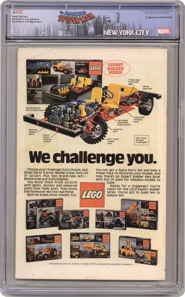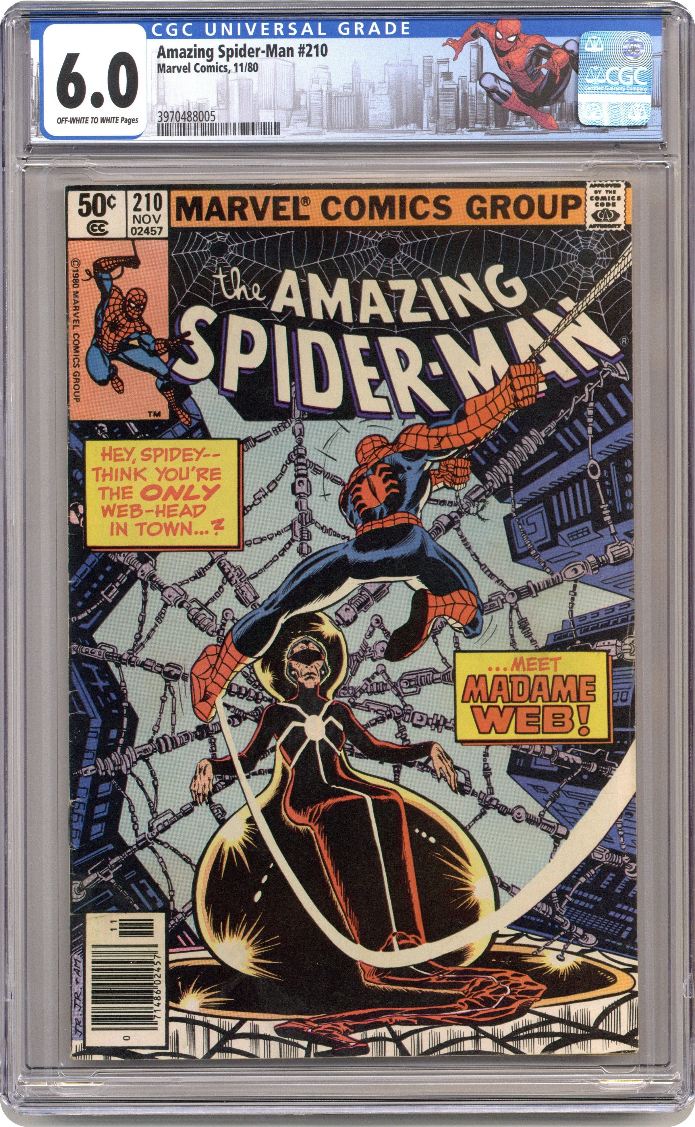 Newsstand Edition. "The Prophecy of Madame Web!" First appearance of Madame Web. Script by Denny O'Neil. Art by John Romita Jr. (breakdowns) and Joe Sinnott (finishes). Cover by John Romita Jr. and Al Milgrom. Masked gunmen barge into the board room of the Daily Globe and kidnap its publisher K.J. Clayton! Fortunately though, the web-slinger is nearby and gives chase! The wall-crawler doesn't catch the criminals, but he does catch a clue! A mysterious clairvoyant called Madame Web is somehow connected to the victim! After befriending the aging soothsayer and heeding her advice, Spider-Man rushes off to the rescue! Can the web-slinger find the missing publisher and get the Daily Globe back in circulation? Cameo appearance by J. Jonah Jameson. (Notes: Peter Parker ends his employment with the Daily Globe. Madame Web appears next in Amazing Spider-Man 216. John Romita Jr. begins his three-and-a-half year run as the penciler of the Amazing Spider-Man title.) 36 pages, full color. Cover price $0.50. Grade: CGC 6.0 explanation of grade Condition: Used (collectible)