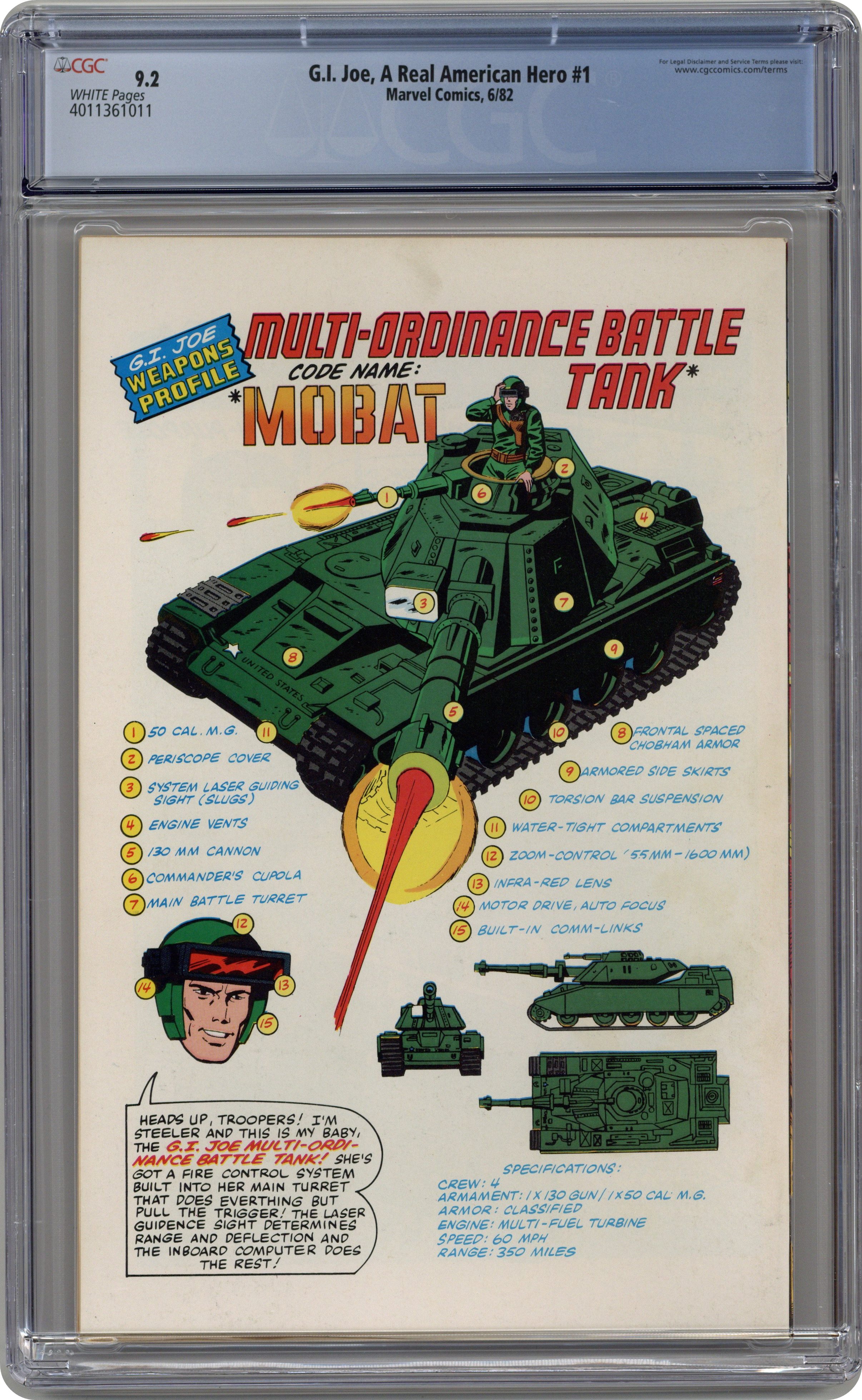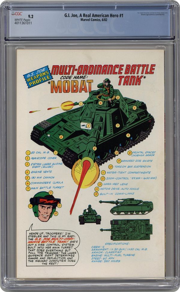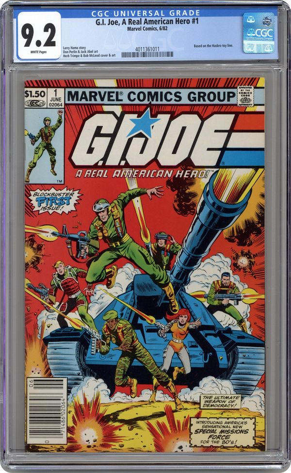 Newsstand Edition. Giant size issue - "Operation: Lady Doomsday!" Written by Larry Hama. Art by Herb Trimpe and Bob McLeod. Cobra is a sinister terrorist organization bent on world domination! There is only one thing standing in their way - GI Joe, the free world's elite strike force and a band of highly trained super soldiers who fight for freedom, justice and the American way. Yo, Joe! 1st appearance of Hawk, Snake-eyes, Scarlett, Clutch, Rock 'n' Roll, Stalker, Breaker, Flash, Grand Slam, Short-Fuse, Grunt, Cobra Commander and the Baroness. Includes back-up story "Hot Potato!" Written by Larry Hama. Art by Don Perlin and Jack Abel. Starring Snake-eyes, Scarlett, and Rock 'n' Roll. Also includes a 2-page diagram of "The Pit," the G.I. Joe Command Center. 52 pages, FC. Cover price $1.50. Grade: CGC 9.2 explanation of grade Condition: Used (collectible)
