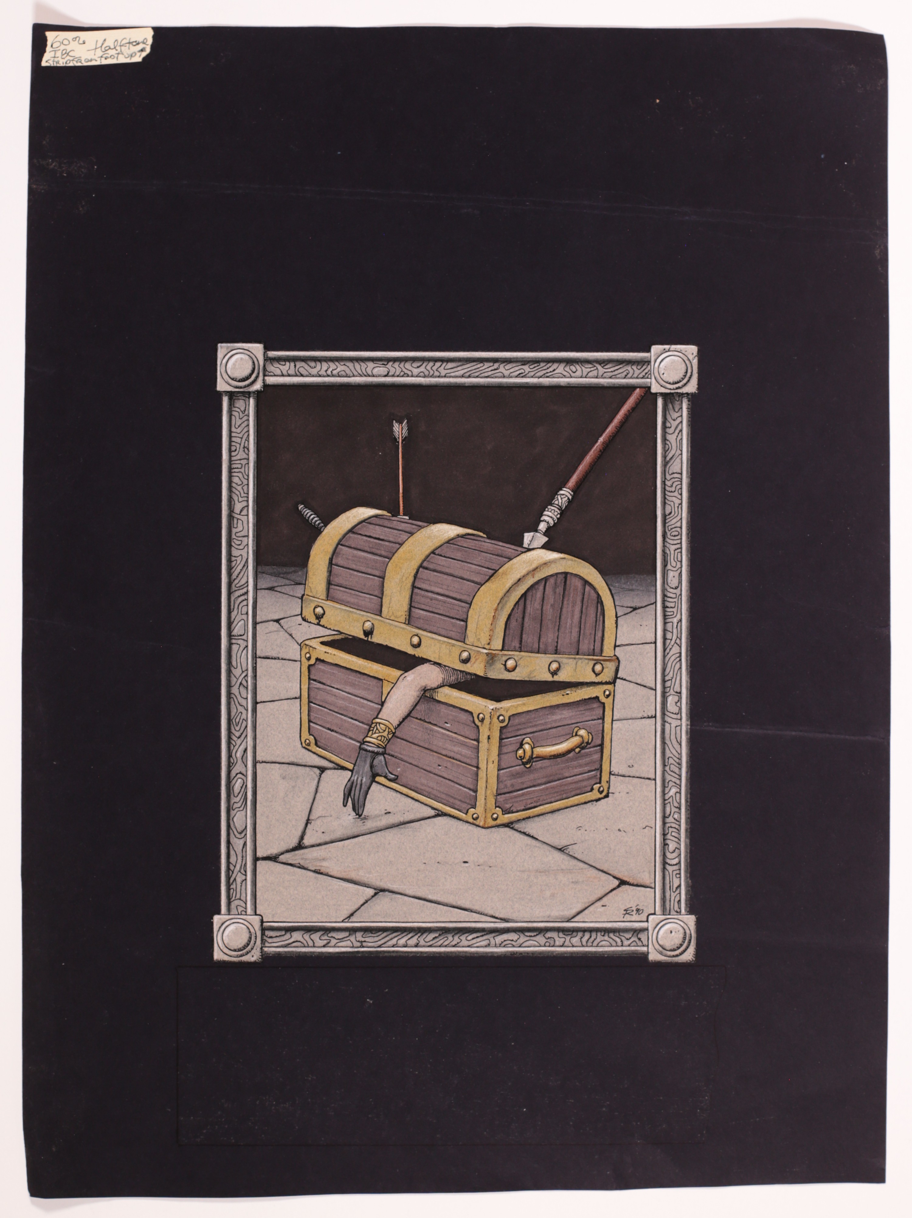Watercolor, colored pencil, and ink on heavy stock. Art measures 9 1/4" x 7", affixed to the center of a sheet of heavy black stock which measures 13" x 17 1/2".