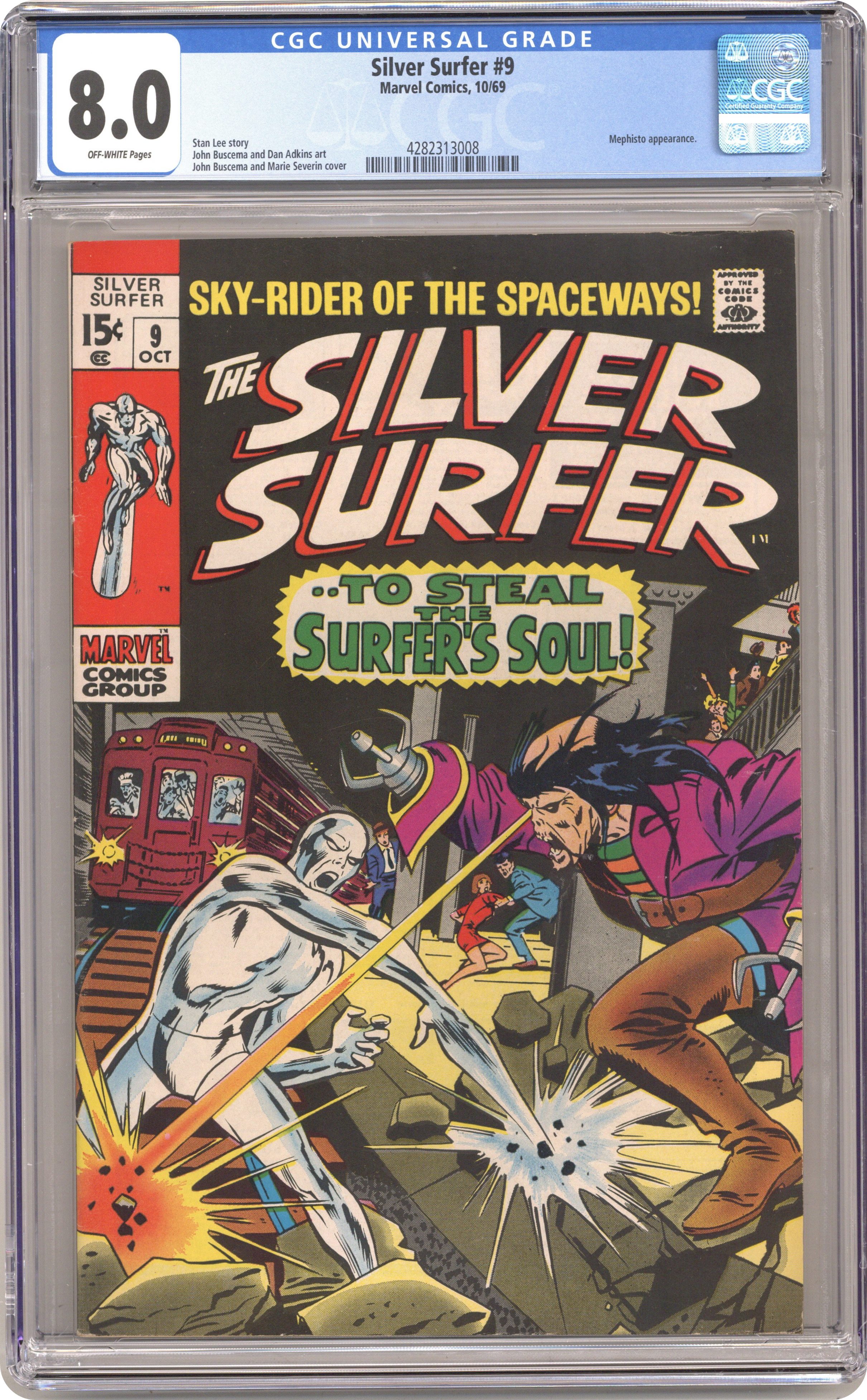 Ended Jul 20 2024 Winning Bid $72 "...To Steal the Soul of the Silver Surfer!" Part 2 of 2. Written by Stan Lee. Art by John Buscema and Dan Adkins. The embodiment of evil in the Marvel Universe, Mephisto, has sent a powerful force for evil to bring him the soul of the Silver Surfer. Cover price $0.15. Grade: CGC 8.0 explanation of grade Condition: Used (collectible)